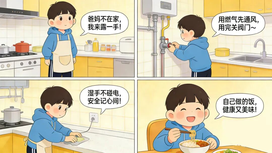 “爸爸妈妈不在家,我来露一手!”小迪看着厨房的食材,想自己煮面条、煎鸡蛋,体验一下小厨师的感觉,但燃气、电器的安全可不能忽视!