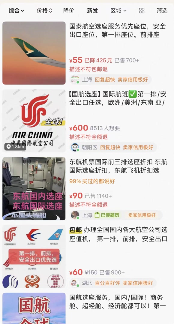 “第一排、安全出口座位任选”“灰色位置可选”……在某二手平台,记者以“选座”作为关键词检索,出现大量航班选座、升舱的中介“代值”,几乎覆盖国内所有航空公司,有的商家甚至宣称“内部员工直接办理操作”。部分商品详情中标注,“选座属于特殊增值商品,航班取消可退一半费用,自己改签、升舱及退票全额不退”。记者注意到,部分商家成交量已达上千单,评论区不乏“成功选座”的用户反馈。