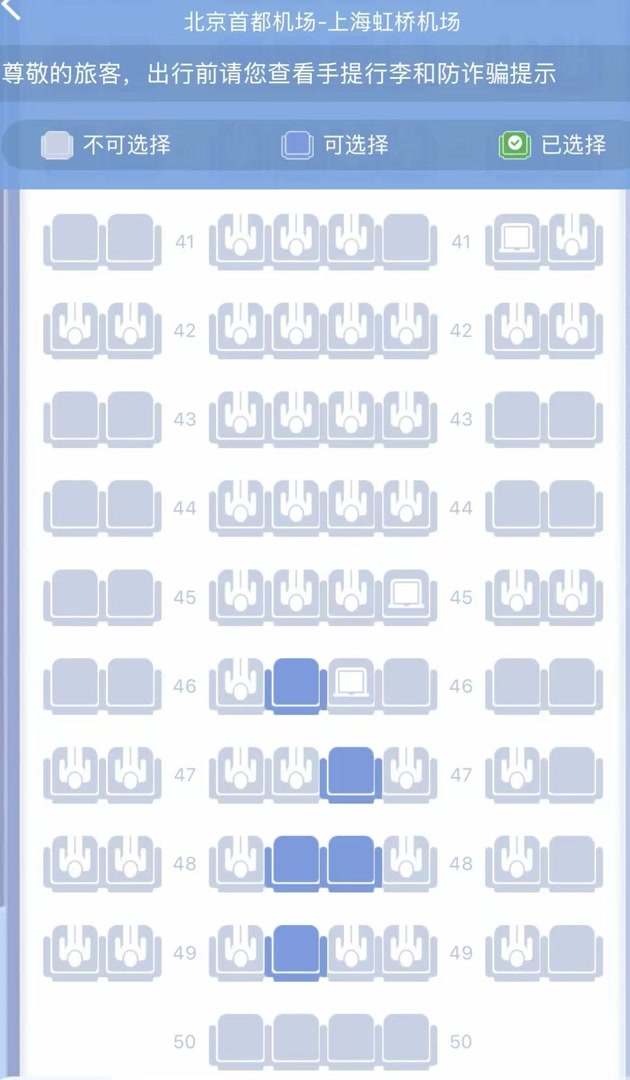 赵先生购买的是折扣机票,第三方平台购票时显示该折扣可在“第8排起提前选座”。但起飞当天选座时却发现,经济舱第8排之后连续十几排的靠窗、过道等热门空位全部被锁,仅剩下几个中间座位。航空公司客服解释,前7排座位需积分兑换,后方大量锁定座位为线上不开放的预留座位,只能在机场柜台现场办理。