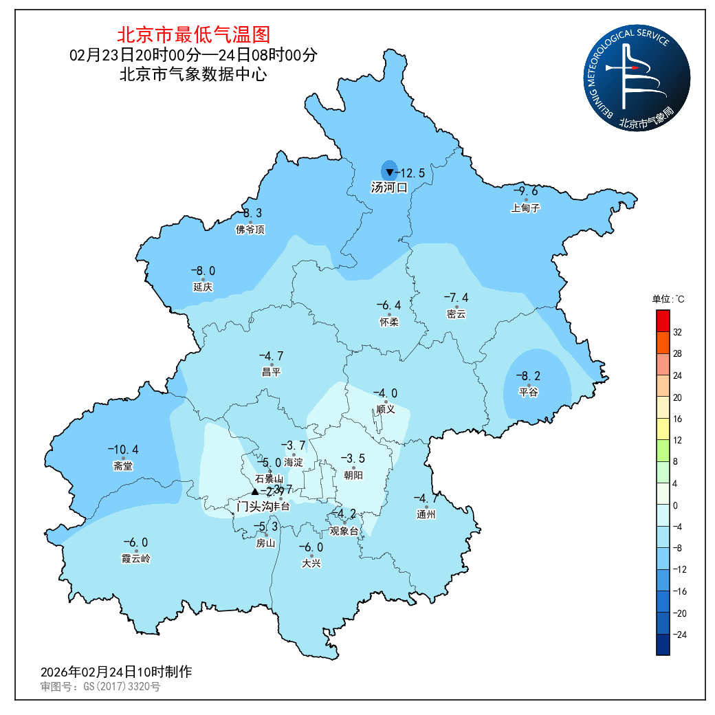 2月23日20时至24日08时,观象台最低气温-4.2℃(06:26)。