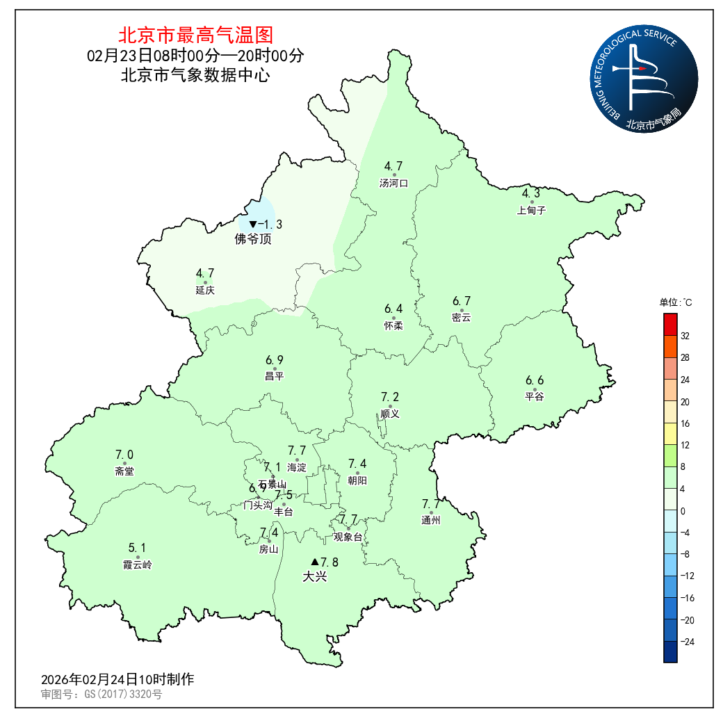 2月23日08时至23日20时,观象台最高气温7.7℃(15:19);