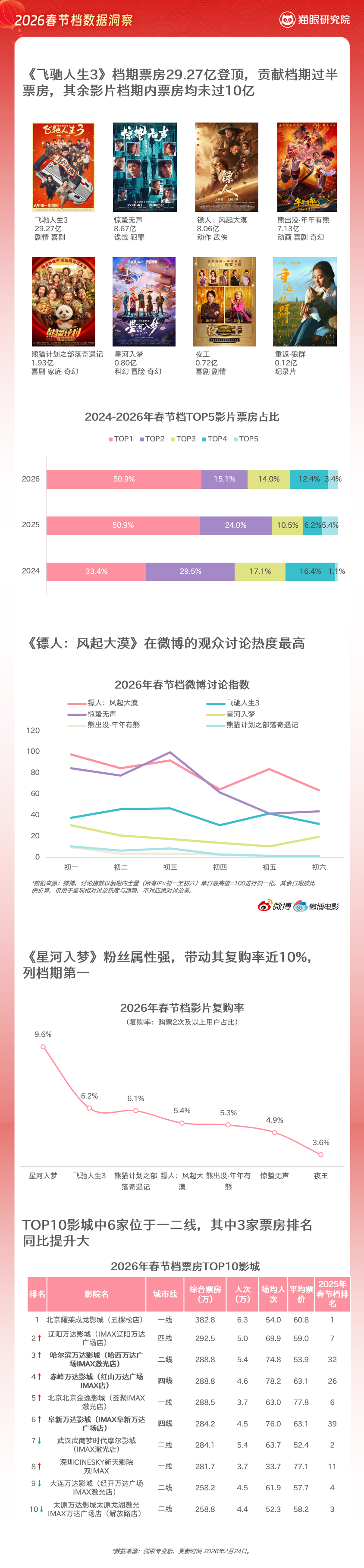 2月24日,猫眼研究院发布《2026春节档数据洞察》(以下简称《洞察》)。《洞察》显示,今年春节档电影总票房达到57.52亿元,总观影人次1.2亿。由于缺乏强流量高热度的爆款大片的带动,档期内整体表现平平,仅《飞驰人生3》票房表现符合行业预期。《镖人:风气大漠》上映后凭借过硬口碑实现票房逆跌,带动假期最后两日大盘跌幅相对较小。