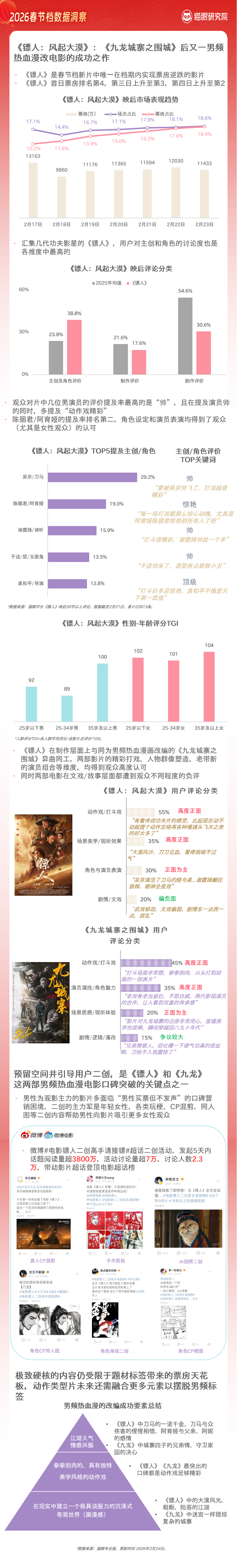 除头部影片领跑外,档期中亦涌现口碑黑马。武侠片《镖人:风起大漠》成为今年春节档唯一实现票房逆跌的影片。《洞察》显示,影片首日票房排名仅第4,到第四日已成功升至第2,场次占比与票房占比同步走高。作为男频热血漫改作品,《镖人:风起大漠》集齐几代功夫影星,精彩的动作戏成核心亮点,观众对主创及角色的评价占比达38.8%,远超2025年均值。值得一提的是,陈丽君饰演的阿育娅获得女性观众的高度好评,观众提及率仅次于吴京饰演的主角刀马,让影片在核心男性受众之外,实现了受众圈层的突破。