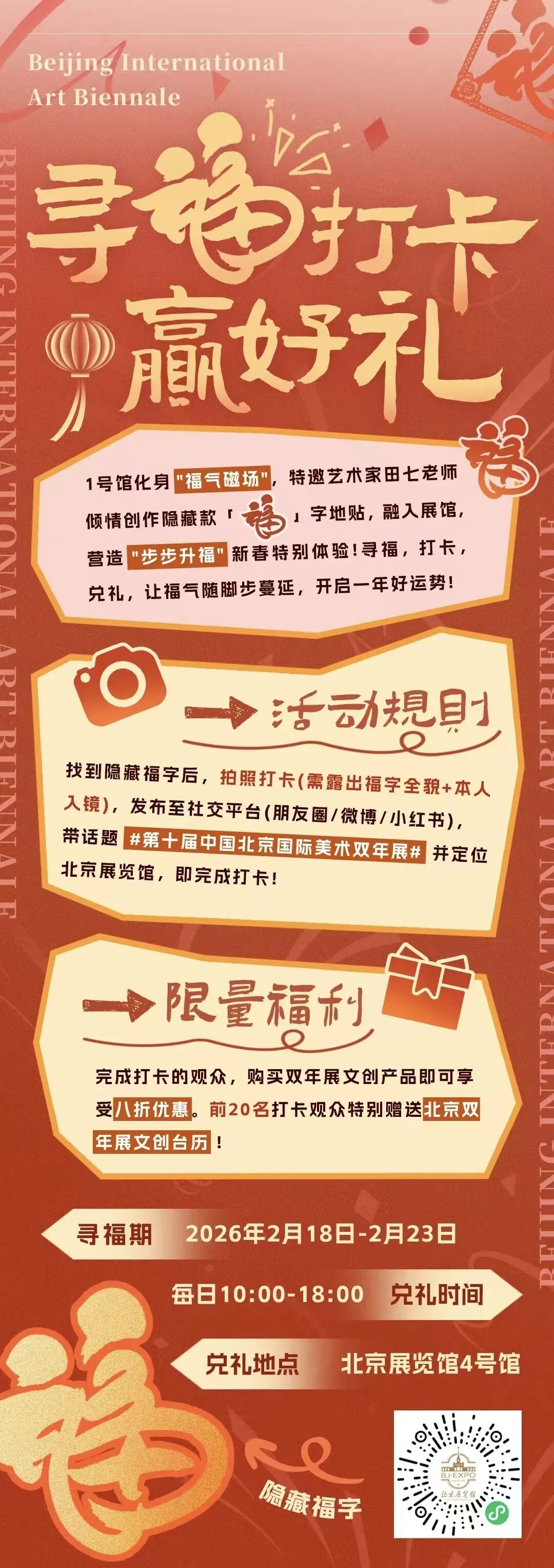 找到隐藏款“福”字后,拍下“福”字全貌+本人入镜的打卡照,带话题#第十届中国北京国际美术双年展#并定位北京展览馆,发布至社交平台(朋友圈/微博/小红书)即可完成打卡。完成后前往4号馆兑礼,文创全场八折轻松拿下,每日前20名打卡者还能获赠双年展文创台历,把一整年的艺术福气带回家。