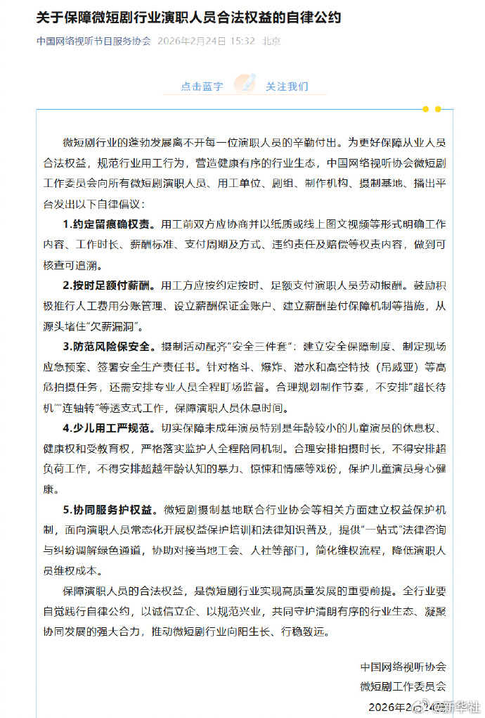 《关于保障微短剧行业演职人员合法权益的自律公约》发布:按时足额付薪酬。用工方应按约定按时、足额支付演职人员劳动报酬。鼓励积极推行人工费用分账管理、设立薪酬保证金账户、建立薪酬垫付保障机制等措施,从源头堵住“欠薪漏洞”。