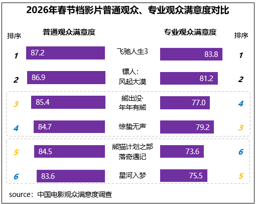 春节档六部影片在不同观众评价中同中存异,居单片满意度第一梯队的《飞驰人生3》《镖人:风起大漠》普通观众、专业观众评价排序一致,第二、第三梯队的影片排序呈现一定差异。主打欢乐治愈的《熊出没・年年有熊》和《熊猫计划之部落奇遇记》相对更受普通观众喜爱,谍战题材《惊蛰无声》、科幻题材《星河入梦》专业观众评价相对更好。
