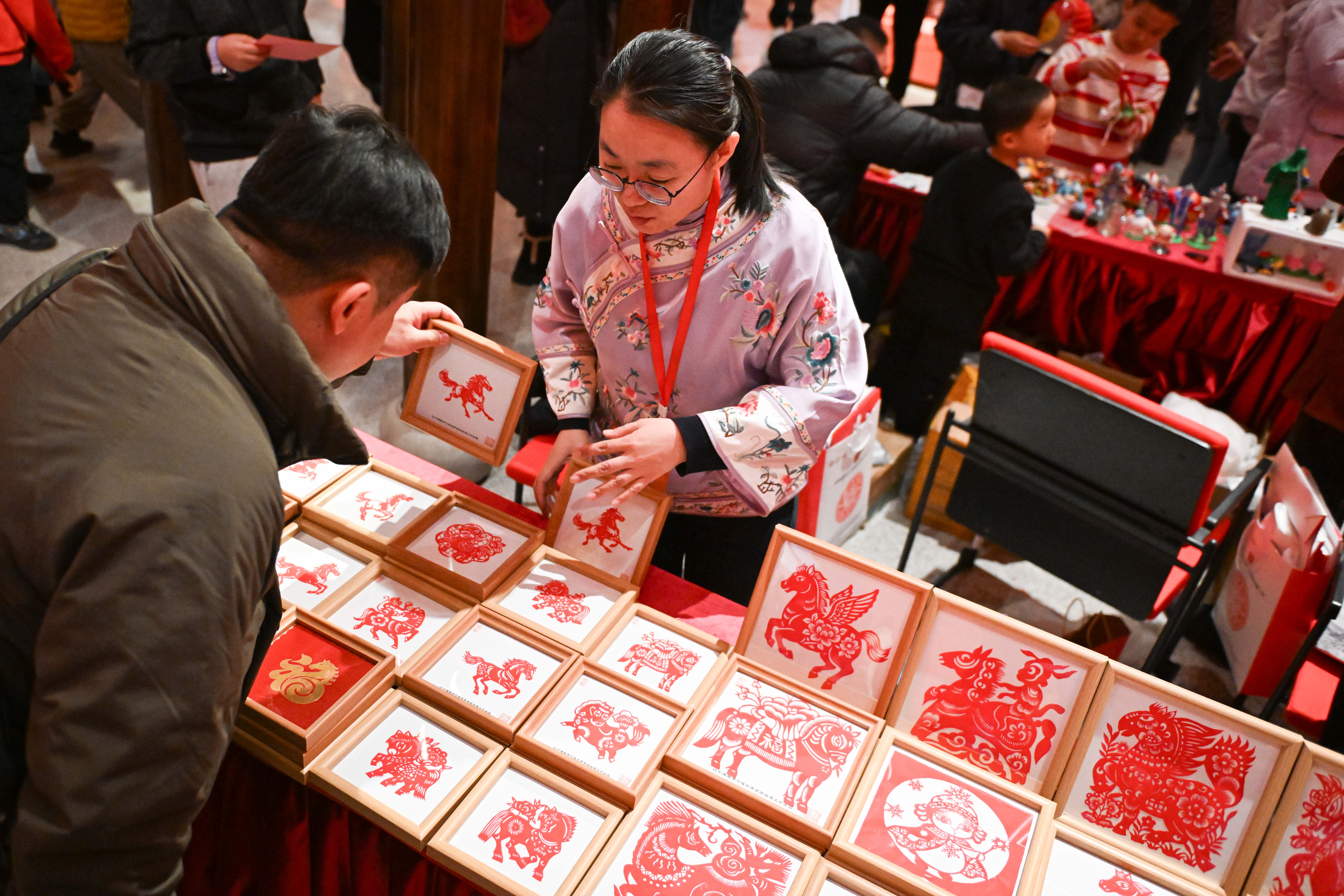 2026年2月15日,观众在北京中国工艺美术馆举办的“过年——丙午春节系列主题展”上挑选生肖马剪纸作品。