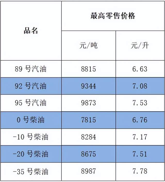 92号汽油由每升6.94元调整为7.08元,提高0.14元;