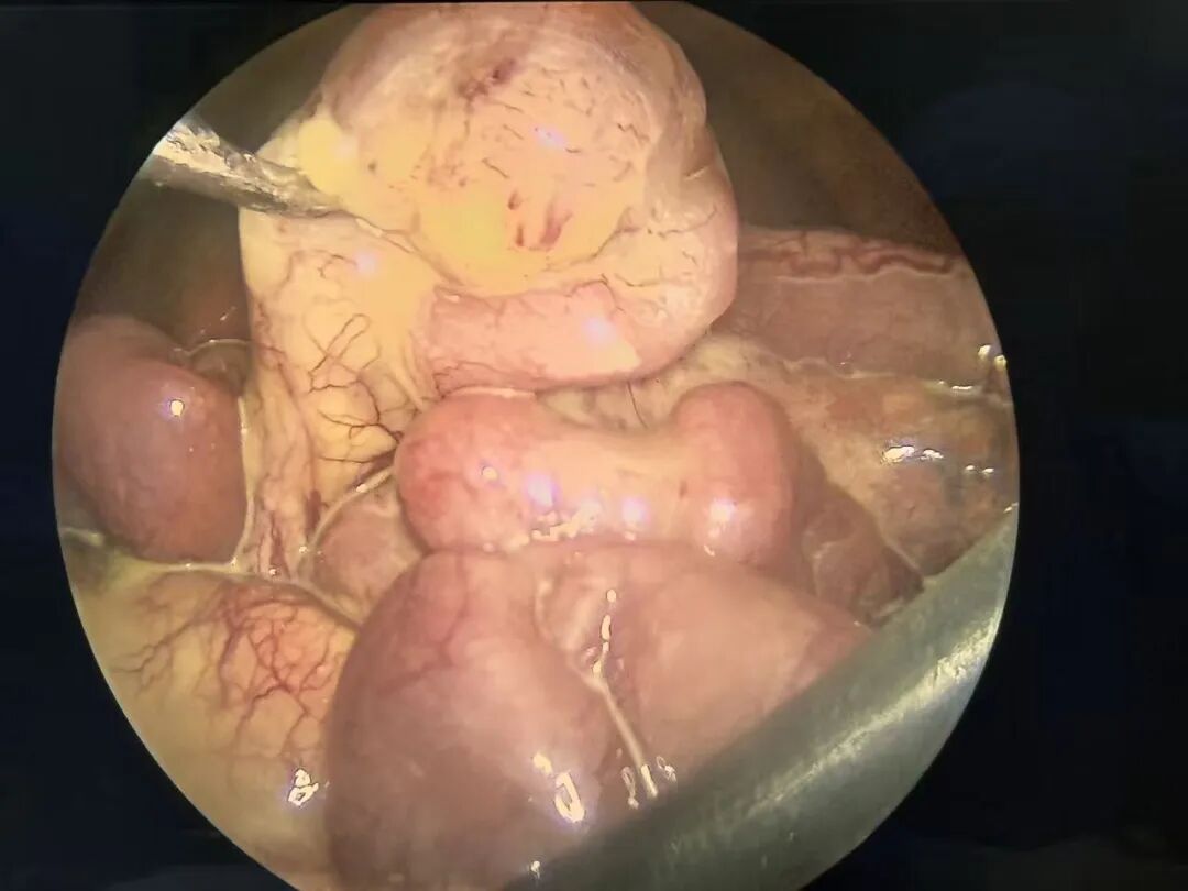 医护团队一边安抚濒临崩溃的患儿家长,高效完成术前谈话与准备工作;一边由张艳霞与张伟联手,为贝贝实施腹腔镜肠扭转复位+Ladd's术。术中可见患儿腹腔已出现乳糜性腹水,肠系膜、肠壁附着乳糜液体,淋巴管回流异常,肠管随时面临缺血坏死的危险。