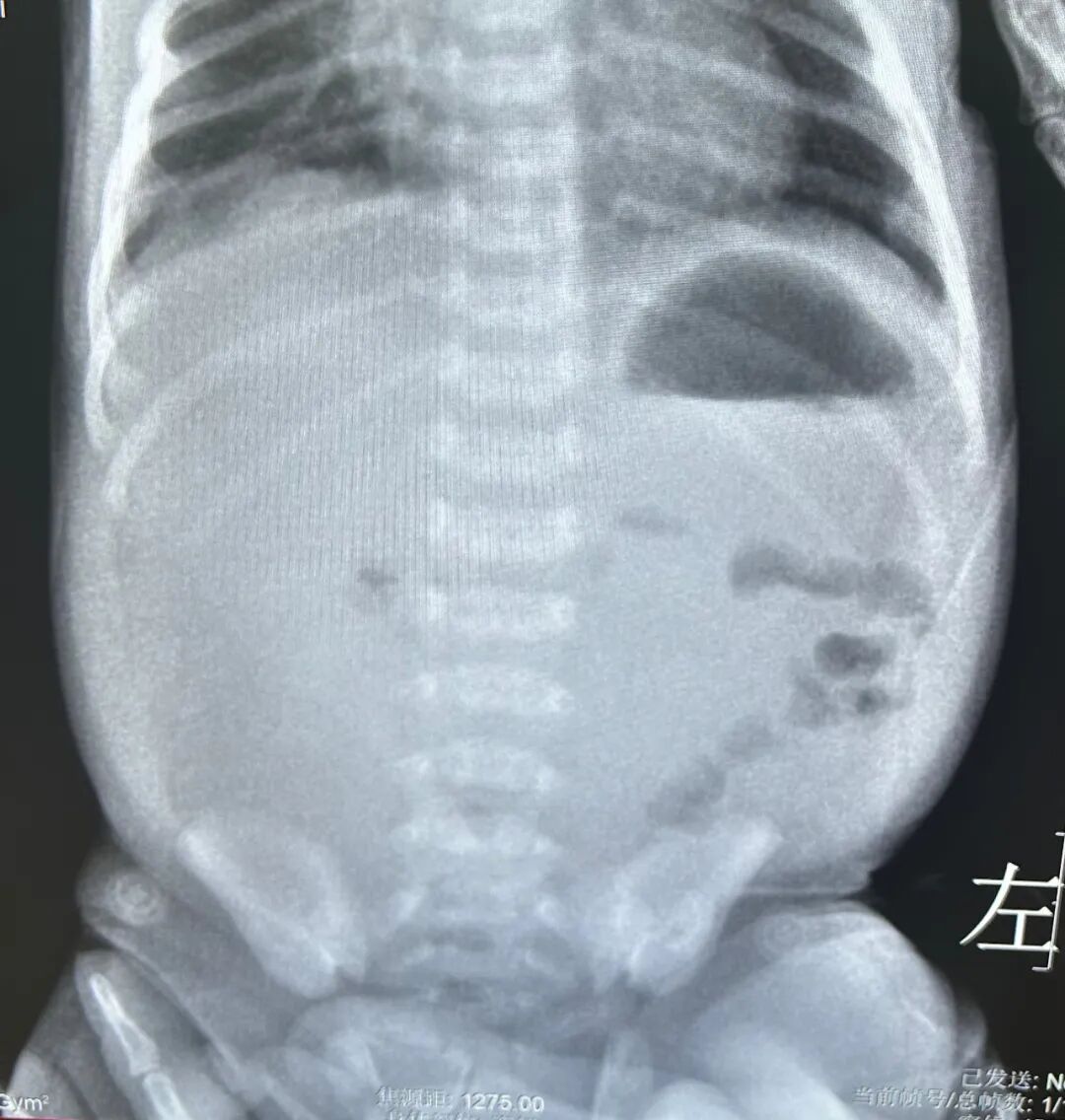 张伟主治医师与吴琼主管护师火速准备转运设备,1小时内便将贝贝安全转入科室。入院后,医护团队快速完成生命体征监测、电解质及血气分析等检查,张伟陪同患儿完成超声检查,最终确诊为先天性肠旋转不良合并肠扭转540度,手术刻不容缓。