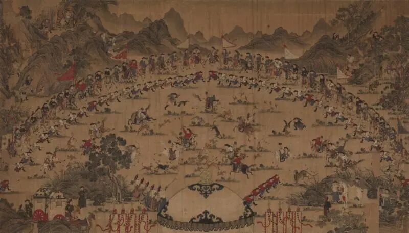 骑射是满人代代相传的看家本领,康熙帝为锻炼军队开辟木兰围场,每年七、八月间,率王公大臣、八旗精兵来此射猎,史称“木兰秋狝”,是清帝北巡中的重要活动。《木兰秋狝图》便是对这一狩猎活动的描绘。