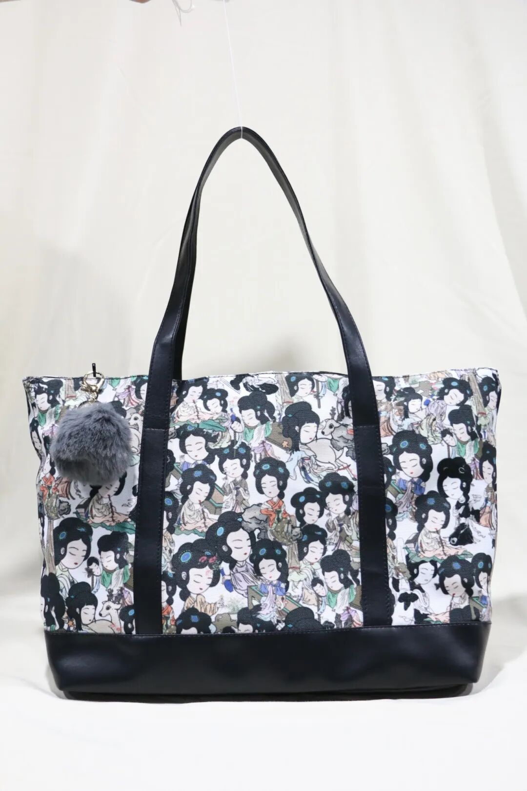 “十美手提包”十位美人姿态各异,梳妆、品茶、闻香、临镜、倚石等等,每个形象卡通画处理,看似随意却是有规律的叠加,加深图案的层次。印在挎包上,整体简约时尚。