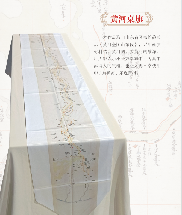 “黄河全图桌旗”源自中国传统文化,采用丝质材料制作,其上印制黄河全图,图案大气庄重,营造出浓厚的文化氛围,蕴含生生不息、蒸蒸日上的祥瑞之意。