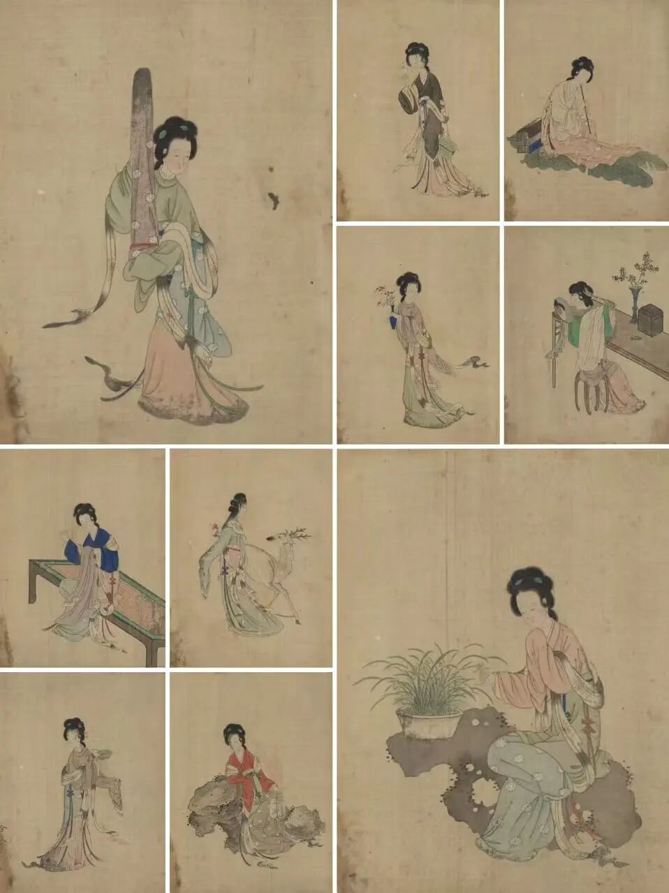 《十美图》为清代宫廷画家冷枚所绘,是山东省图书馆馆藏珍品,作品描绘了仕女临镜、赏兰、吹箫、闻香、倚石、梳妆、品茶等优雅闲适的生活场景。