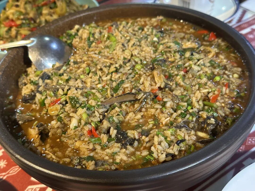 鸡肉烂饭堪称佤族待客的经典硬菜,这道菜在佤族是节日时招待贵宾的专属美味,制作工序繁琐且需提前一天预订。整只鸡搭配姜块、草果、花椒等香料、调料慢火炖煮,煮好后将鸡肉捞出放凉、手撕成细条,大米放入鸡汤中煮至米粒软烂,小米辣、大蒜、花椒加少许盐舂成香辣泥,茴香、薄荷叶、阿佤芫荽、香柳切细碎,最后再将鸡丝、香辣泥、所有香草碎放入烂饭中,加适量盐、少许酱油充分拌匀,盖上盖子再焖3分钟,独特的香料与软糯的米饭交融,每一口都是佤族最真挚的待客诚意。