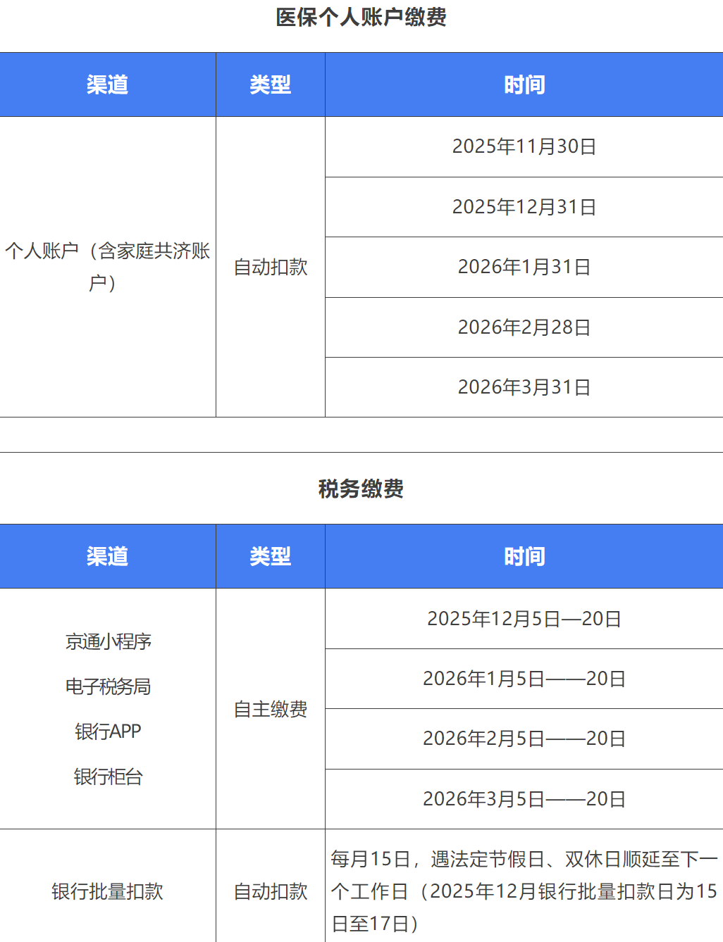 银行批量扣款日为每月15日,遇法定节假日、双休日顺延至下一个工作日(2025年12月银行批量扣款日为15日至17日)。参加批量扣款的缴费人在批量扣款期间不能使用其他渠道缴费。