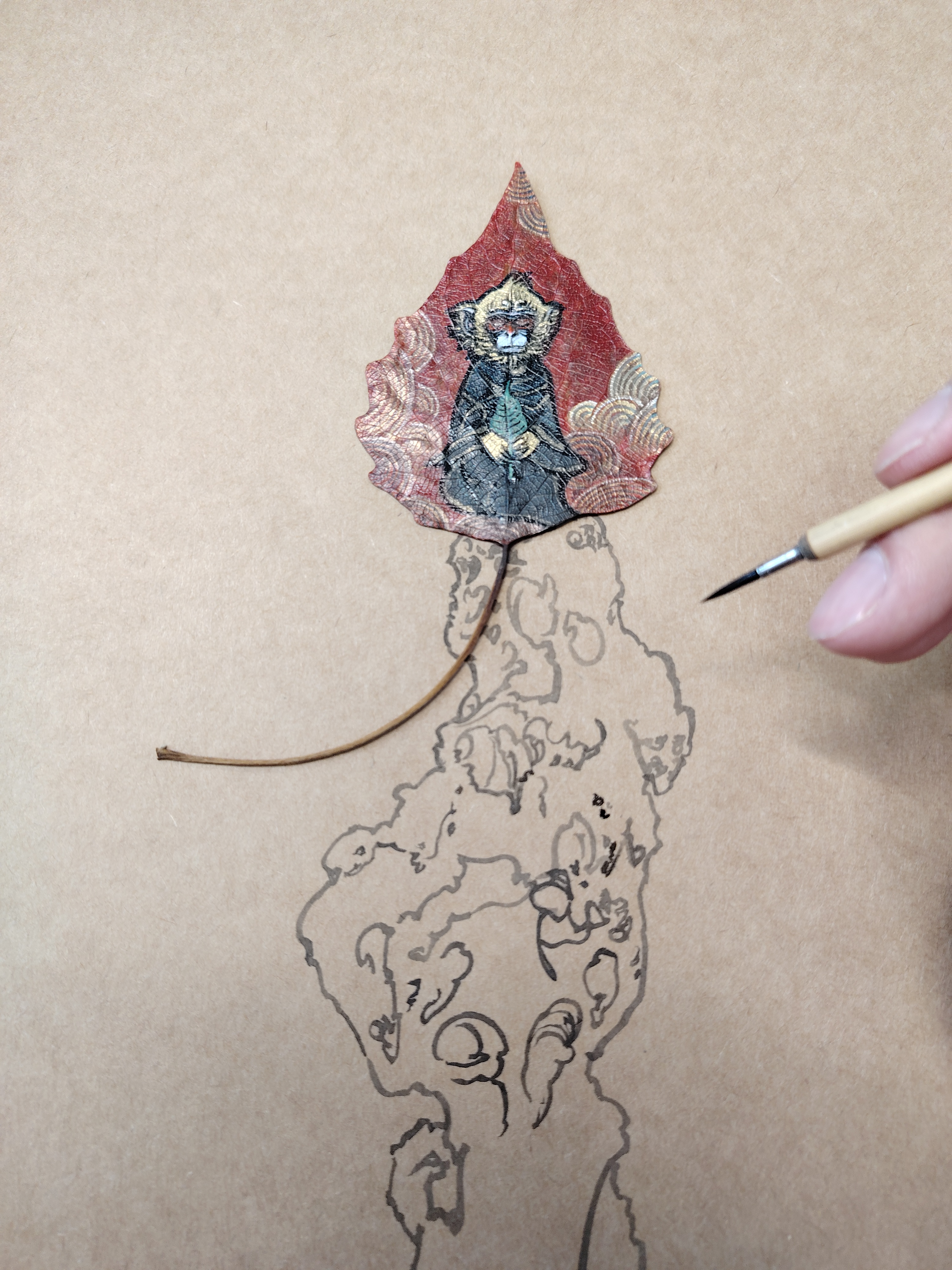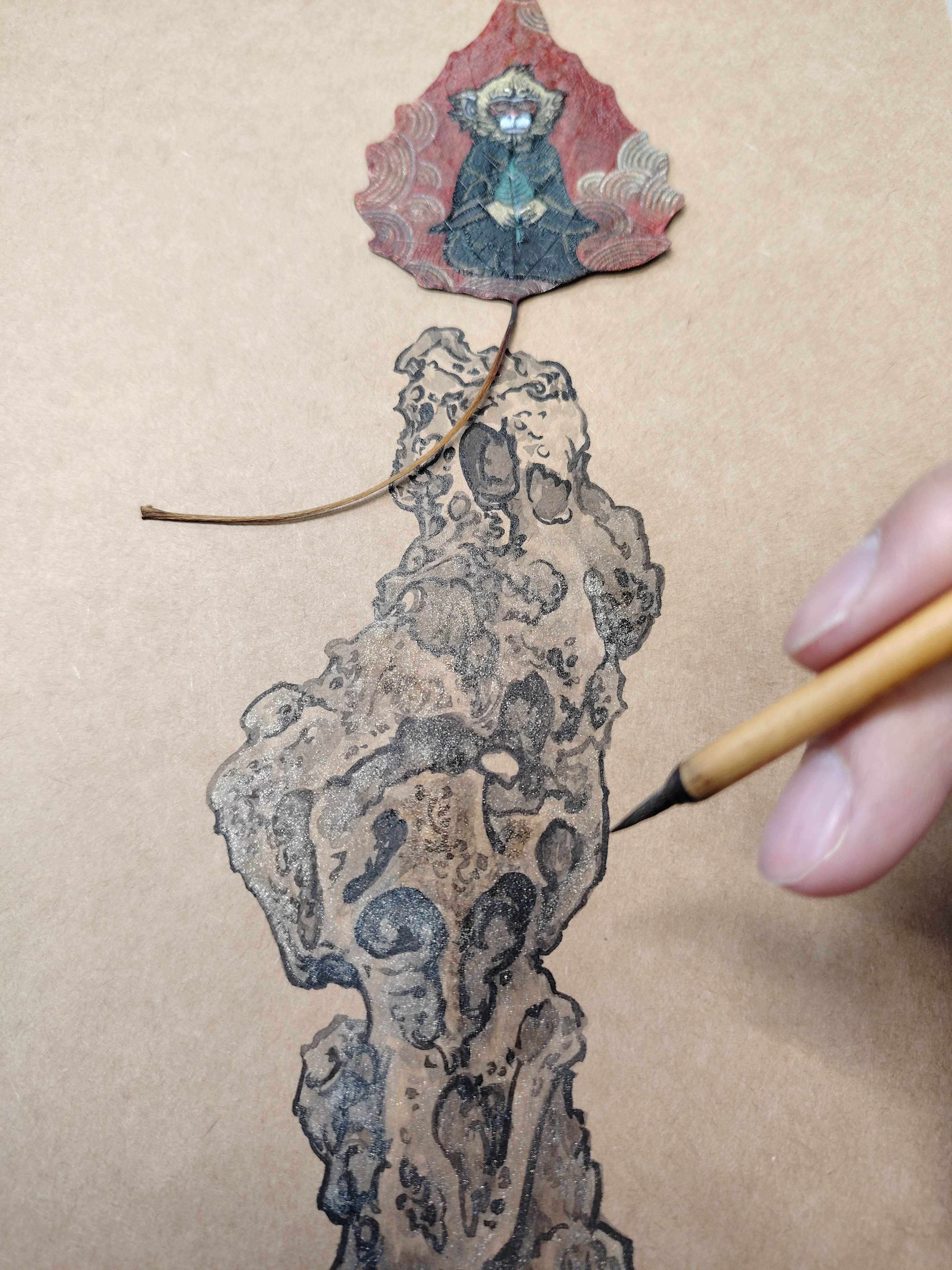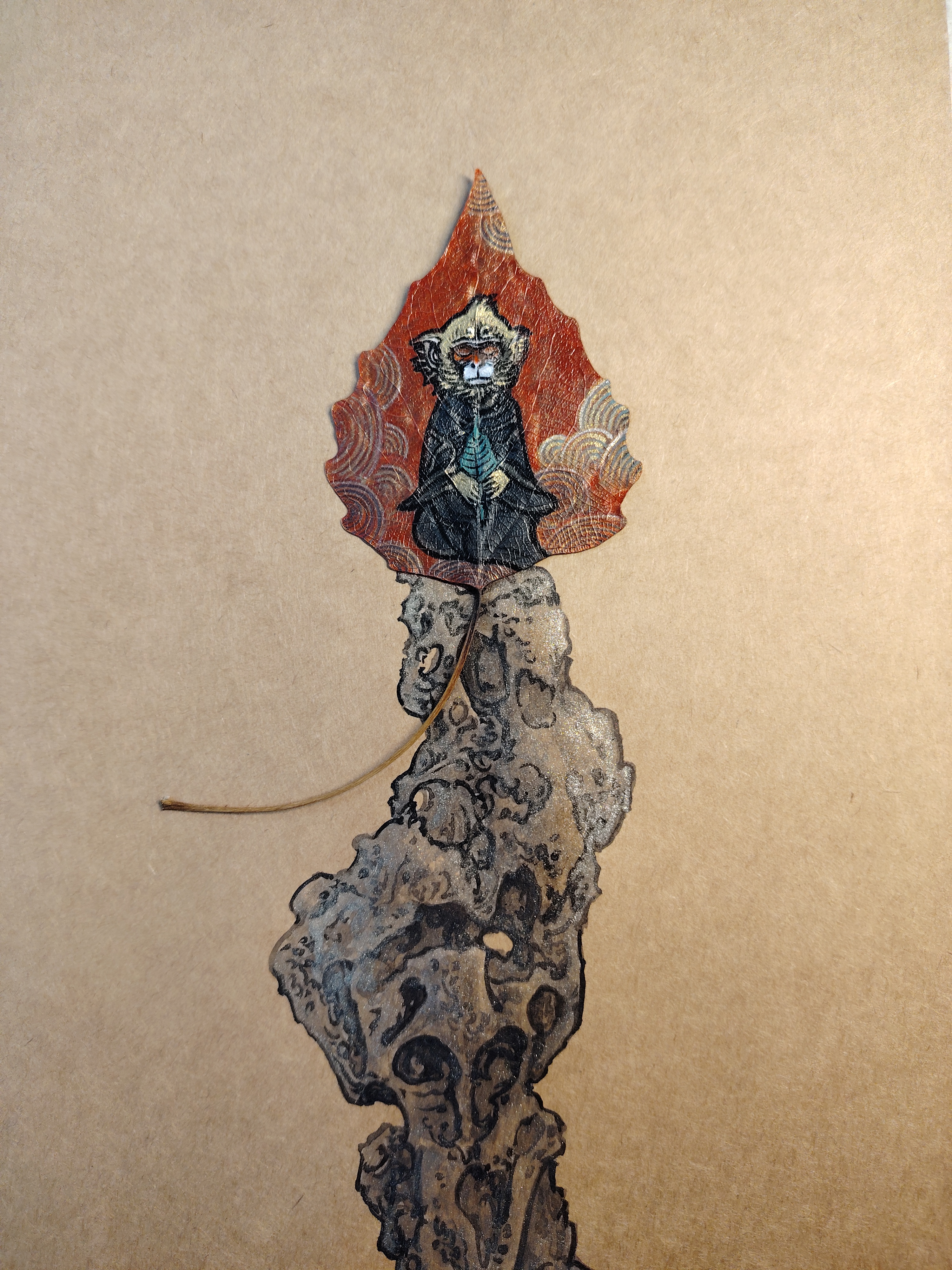 此作品取北京颐和园排云殿前太湖石为灵感,石猴静思端坐于石顶,手拿菩提叶。而叶画的叶柄恰似猴尾展开,动静之间暗喻不动如山,心有波涛之意。