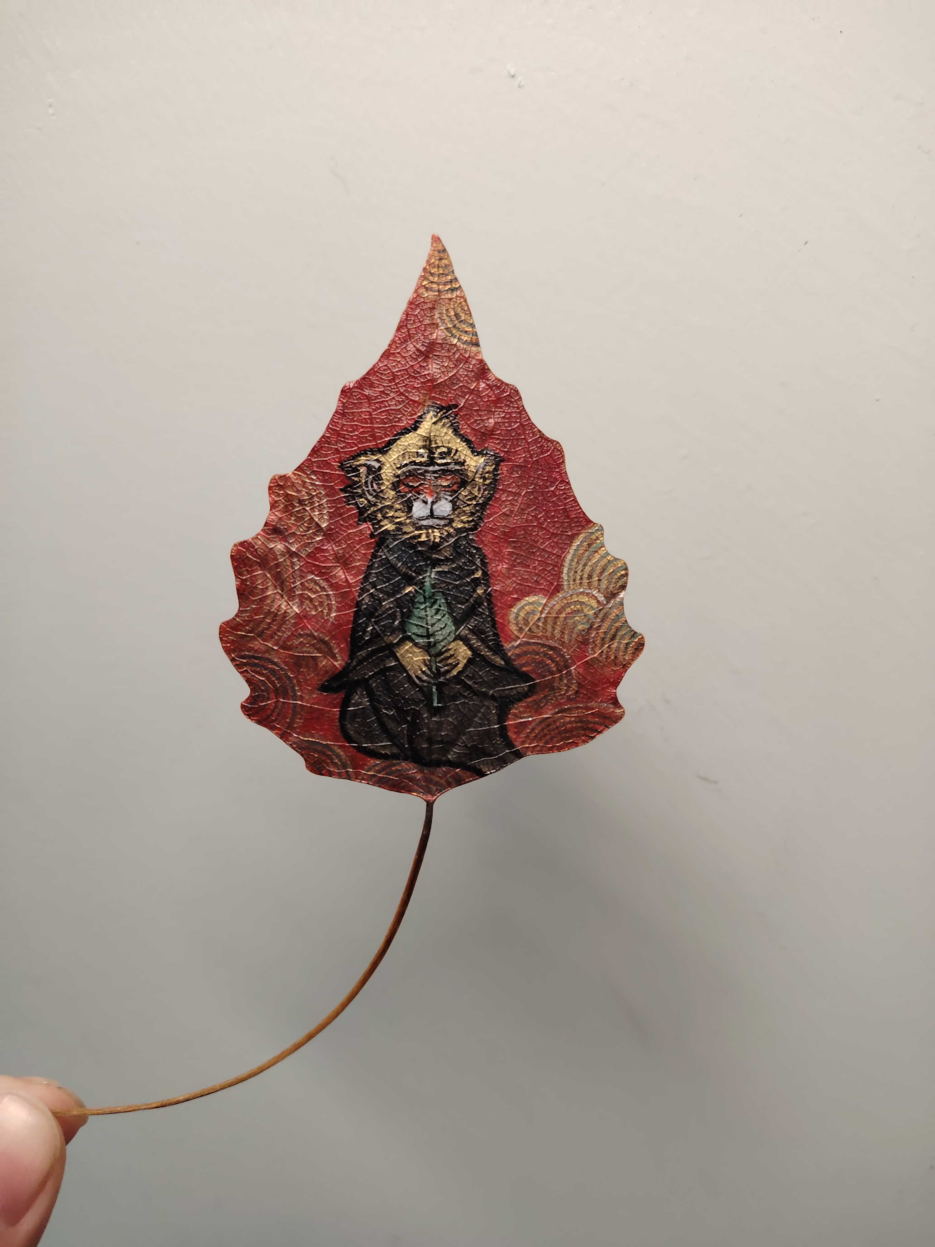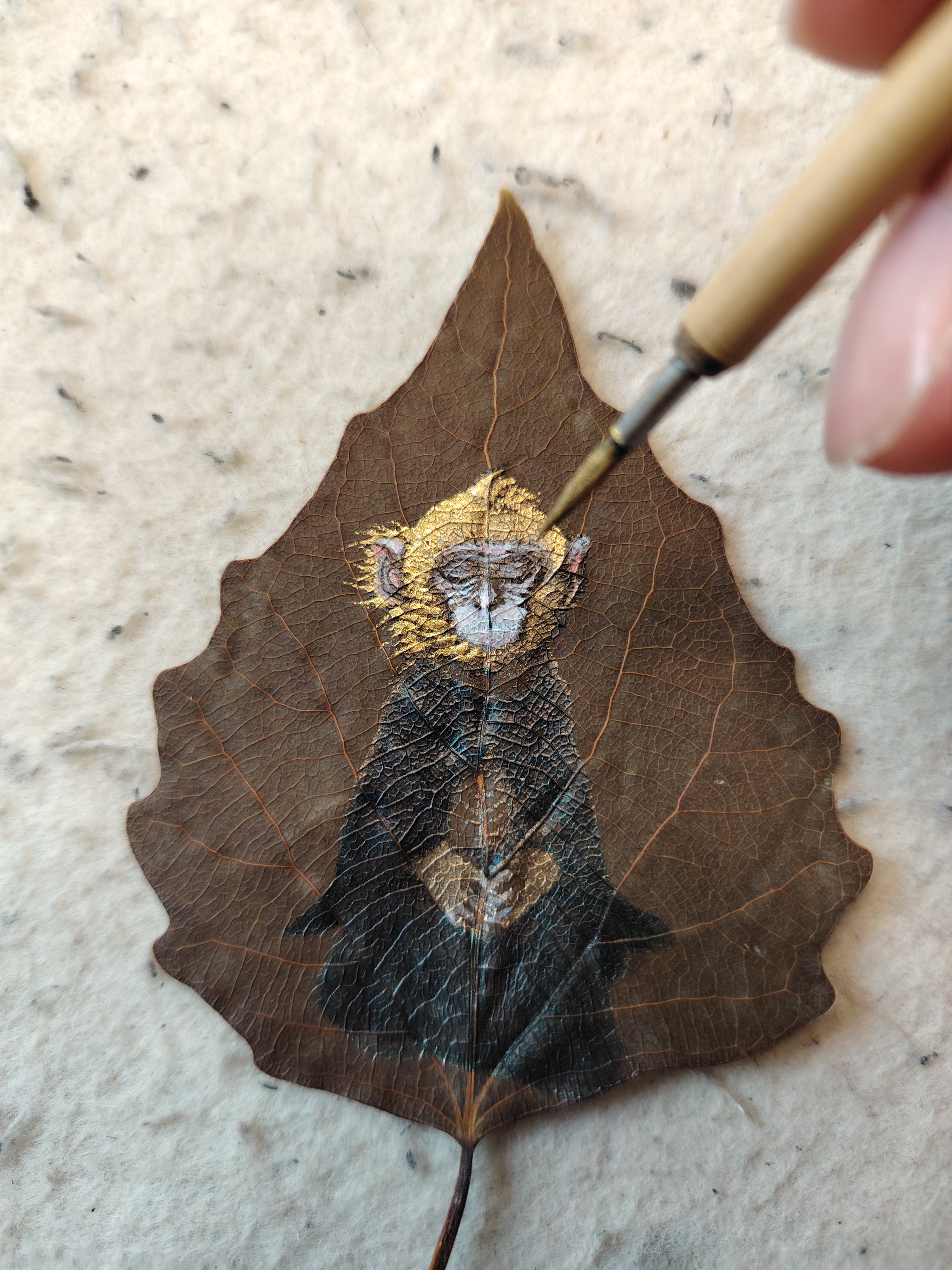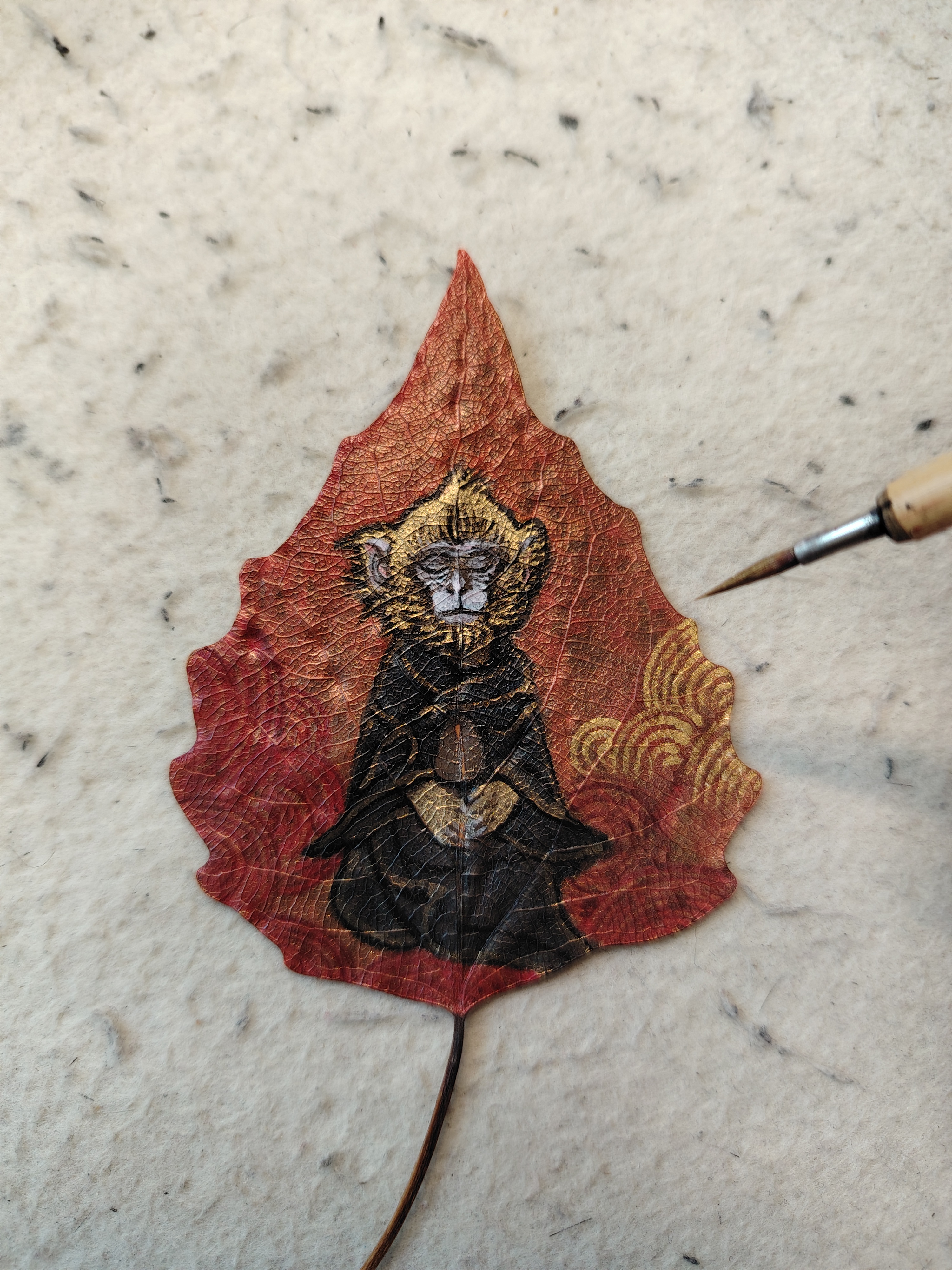 此作品取北京颐和园排云殿前太湖石为灵感,石猴静思端坐于石顶,手拿菩提叶。而叶画的叶柄恰似猴尾展开,动静之间暗喻不动如山,心有波涛之意。