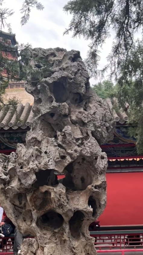 悟空背后的云也暗含排云殿寓意,与下方太湖石共同构成:神仙拨开云雾、从仙境中显现的奇幻景象。