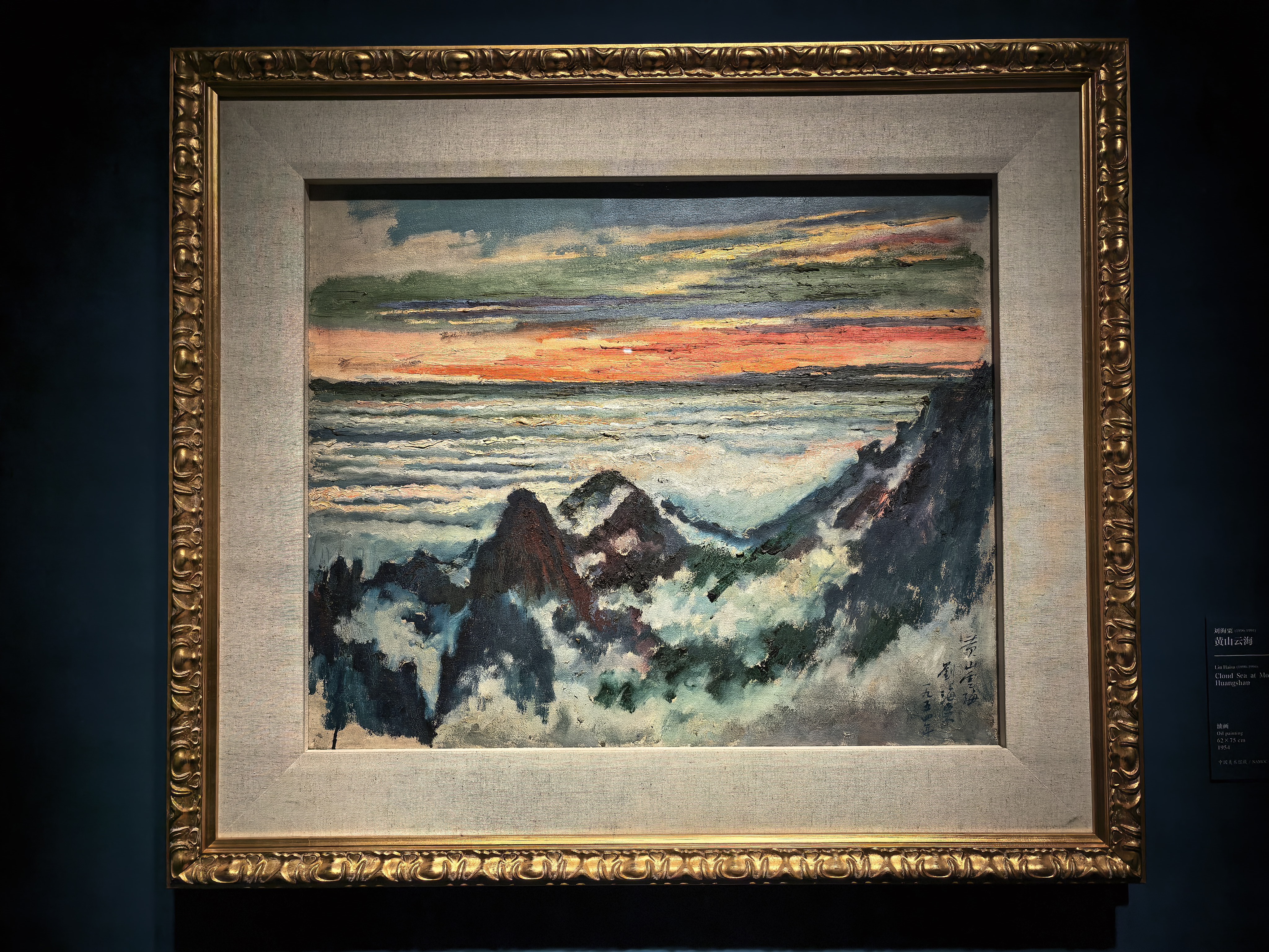 刘海粟的《黄山云海》悬于《藏宝阁》的另一面墙。1954年,快六旬的老人第六次登临黄山,随身携带的不仅是油画箱,更有塞尚的几何构成理论与印象派的光色革命。画布上,横向延展的云霞如梵高《星月夜》般旋转升腾,而山体的块面却保持着塞尚式的结构理性。他用刮刀厚涂的橙红与钴蓝,将日出时分云海的瞬息万变凝固成永恒——那是生命对永恒的渴慕,是刹那对不朽的征服。