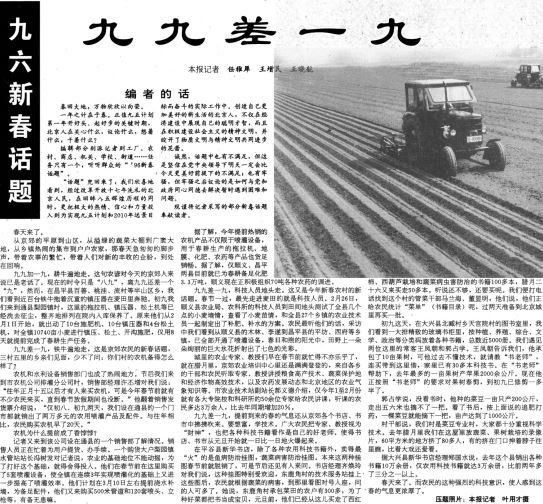 1996年新春,在平谷县新华书店,除了各种农用科技书籍外,卖得最火的是鱼病、蔬菜病害防治挂图。书店经理齐焕玲说,东鹿角村承包菜田的农户有300多家,为了种好菜都把书当成宝贝,村技术服务站挂上这些图后,农民就根据蔬菜的病害到那里看图,问的人可多了。在大兴县北臧村乡天宫院村的图书室里,“常客”王凤朝又来看书了。他承包了10亩果树,不懂技术就请教“书老师”,连买带借,家里已有30多本科技书。在“书老师”帮助下,1995年最多的一亩果树产苹果2000余公斤。春节这阵子,他正按照“书老师”的要求,对果树进行春剪。(1996年2月29日《北京日报》1版,《九九差一九》)