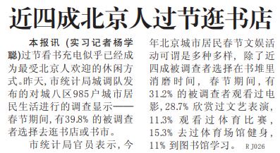 随着学习型社会的营造,读书度假成为许多人不约而同的选择。2003年春节期间,国家图书馆到馆人数总计42514人次,最多的一天达9000人次,创历史新高。(2003年2月11日《北京日报》11版,《春节读书市场新变化》)市统计局的调查显示,2005年春节期间,有39.8%的被调查者选择逛书店或书市,11%到图书馆学习。过节看书充电,已成为深受北京人欢迎的休闲方式。(2005年2月24日《北京日报》8版,《近四成北京人过节逛书店》)