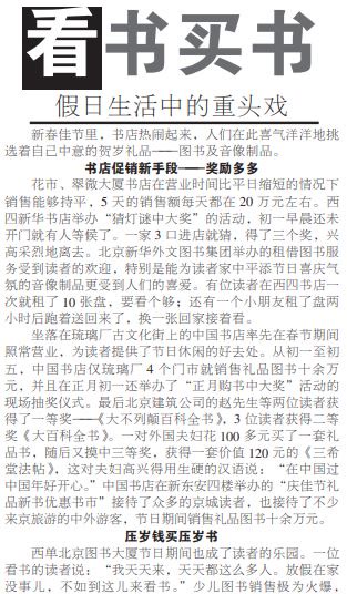 2000年春节,人们喜气洋洋地来到书店挑选贺岁书。北京图书大厦的图书销售火爆到收款台都添了新收款机。一位看书的读者说:“我天天来,天天都这么多人。”很多人用压岁钱买压岁书,特别是一些小读者,直接打开红包付书款。想赠送亲朋好友礼品书的人们欣赏品位和档次也提高了,大多挑选《朱自清散文》《莫泊桑小说选》一类的文艺图书。从初一至初五,北京图书大厦的销售额同比增加了62%。(2000年2月13日《北京晚报》24版,《看书买书 假日生活中的重头戏》)