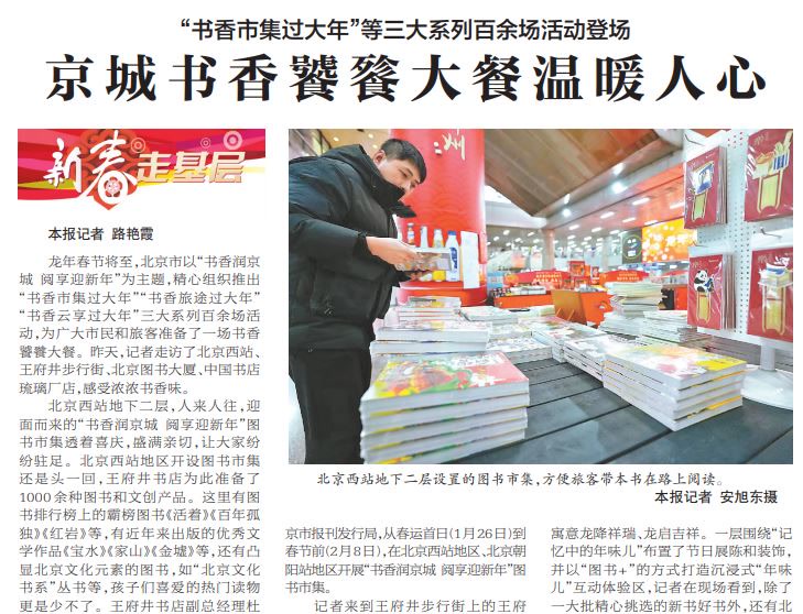 2024年春节,北京精心组织推出“书香市集过大年”“书香旅途过大年”“书香云享过大年”三大系列百余场活动。北京图书大厦以“图书+”方式打造沉浸式年味儿互动体验区,陪读者过除夕;北京西站首次开设图书市集,推出“给家乡孩子带一本书”活动,为旅客购书打折优惠。(2024年2月8日《北京日报》2版,《京城书香饕餮大餐温暖人心》)