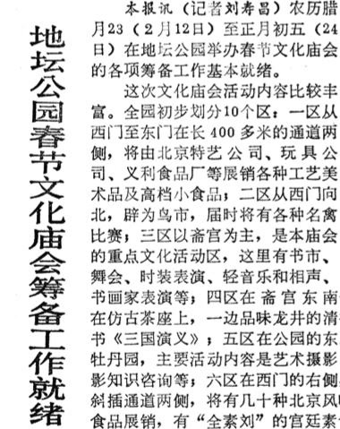 1985年,地坛公园首次举办的春节文化庙会设立了书市。(1985年1月31日《北京日报》1版,《地坛公园春节文化庙会筹备工作就绪》)此后,北京的春节庙会、游园会越办越多,书市也逐渐成为其中重要的文化活动。如龙潭庙会,1992年首次开办旧书市场,1994年扩大为文化书市一条街,由市新华书店的东城、崇文两个区店组成。60多米长的街市上,科技、小说、教育、儿童和各种工具书等上千个品种的图书优惠展销,为逛庙会的人们提供充足的精神食粮。(1994年1月31日《北京日报》2版,《欢歌笑语聚龙潭 今春庙会更新鲜》)