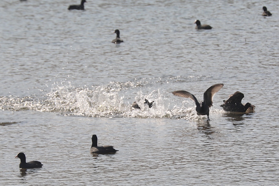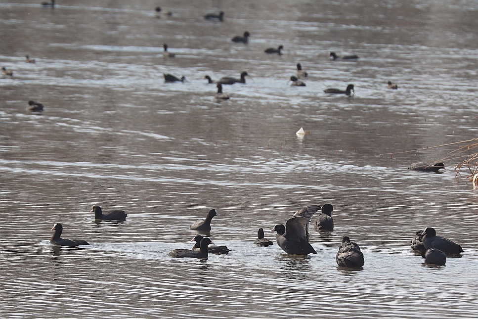 开春气温回暖,北京凉水河水面上迎来成群白骨顶鸡。这些通体黑羽、额头具白色骨顶的水鸟,或悠然游弋,或潜水觅食,为河畔增添生机。