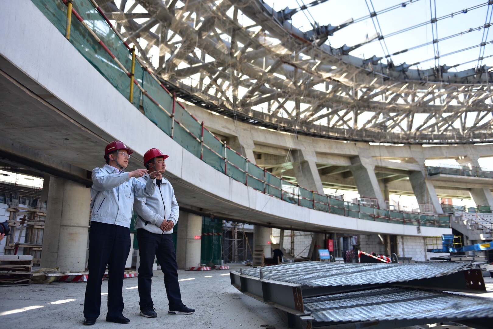 没有成熟经验可循,王泽强带领团队,足足花了三个多月的时间摸索、计算,最终敲定环向索张拉方案:每个圆环选取4个点位同步进行张拉,让直径100余毫米的钢索在节点内缓慢滑移。可现实却给了他们一记“闷棍”——原本用来减少摩擦的聚四氟乙烯片效果未能达到预期,每个节点的受力损失率超过设想,需要对受力重新计算。当时已临近春节,工人们归心似箭。而场馆在当年的5月份将迎来首场测试赛。