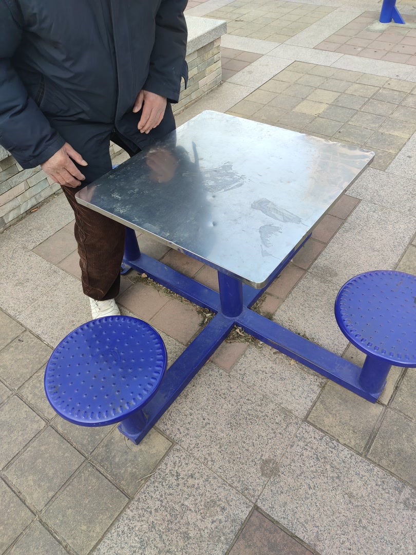 “就说这个棋牌桌吧,你看看,我坐下去多费劲。”棋牌桌和圆凳用金属方管焊接在一起,但棋盘桌和圆凳之间的空隙太小,老年人腿脚不灵便,蹲下和起身都很受限制。