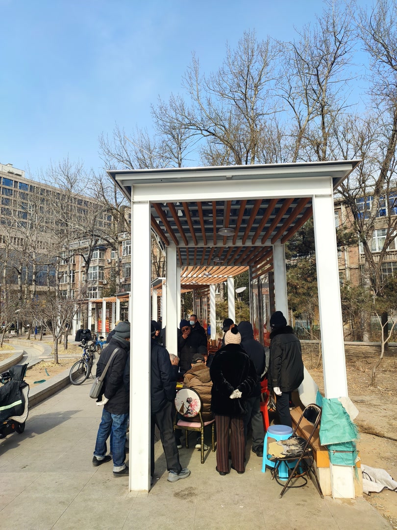 万源西里的老方很羡慕万源东里有文化广场,“就在那边,热闹”。老方本身喜欢清静,但他不否认,“很多老人在小广场能玩一上午”。对那些喜欢热闹、喜欢结伴一起玩的老年人,小广场不仅提供健身场地,还是社交平台。文化广场的长廊是有顶棚的,在这里下棋玩牌,就比在万源西里健身路径舒适得多。十几人凑成一堆,看棋的甚至比下棋的还认真,有的聚精会神,有的低声耳语。长廊底下,像这样的棋局牌局,有四五处。