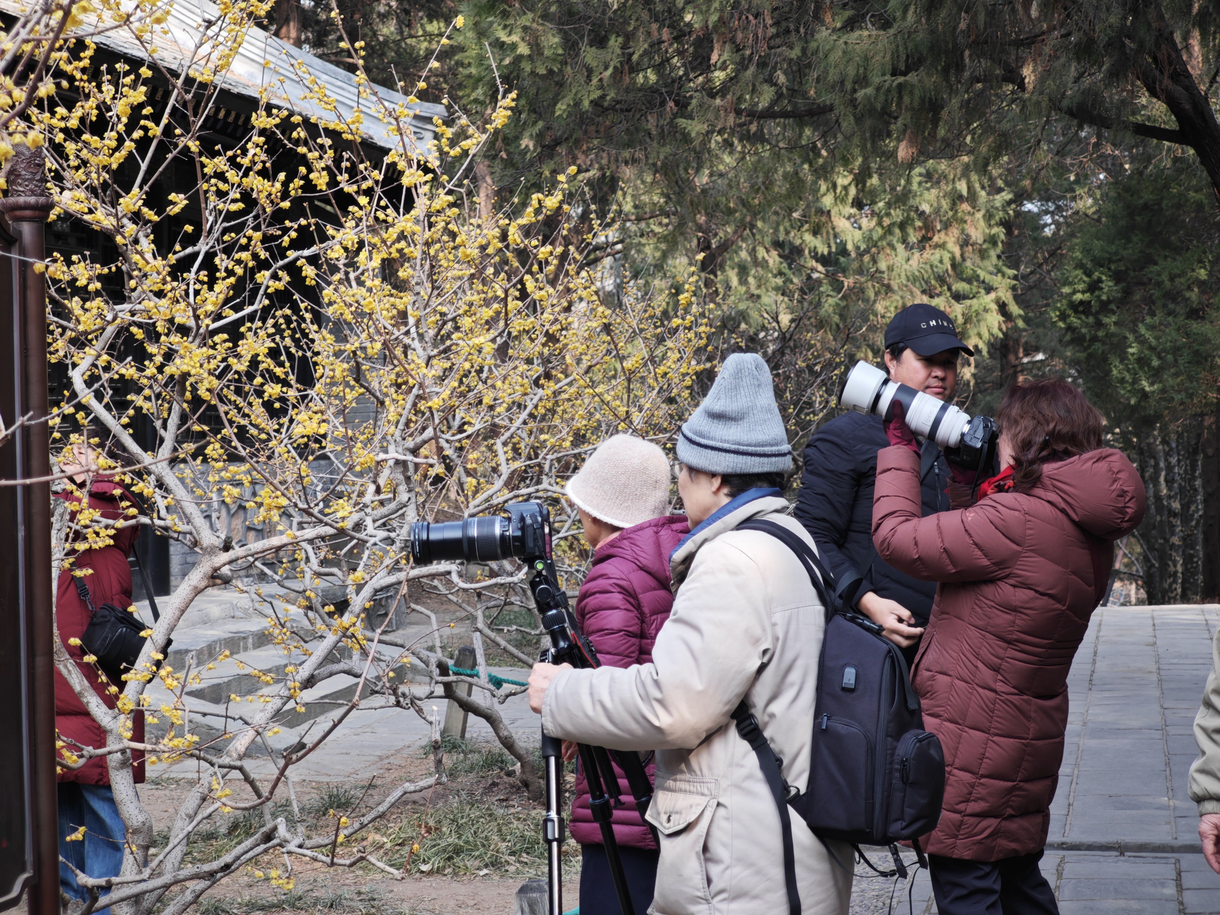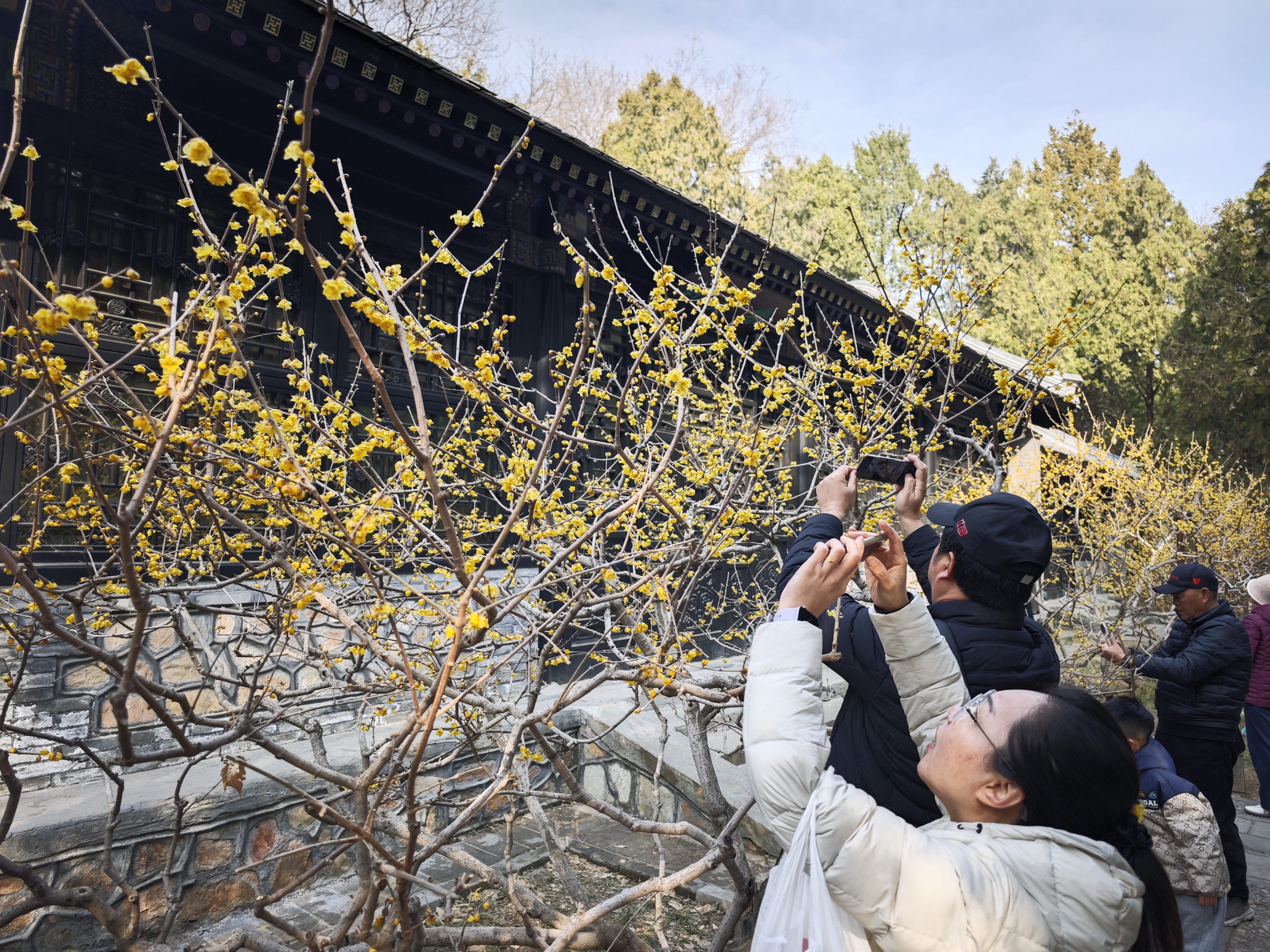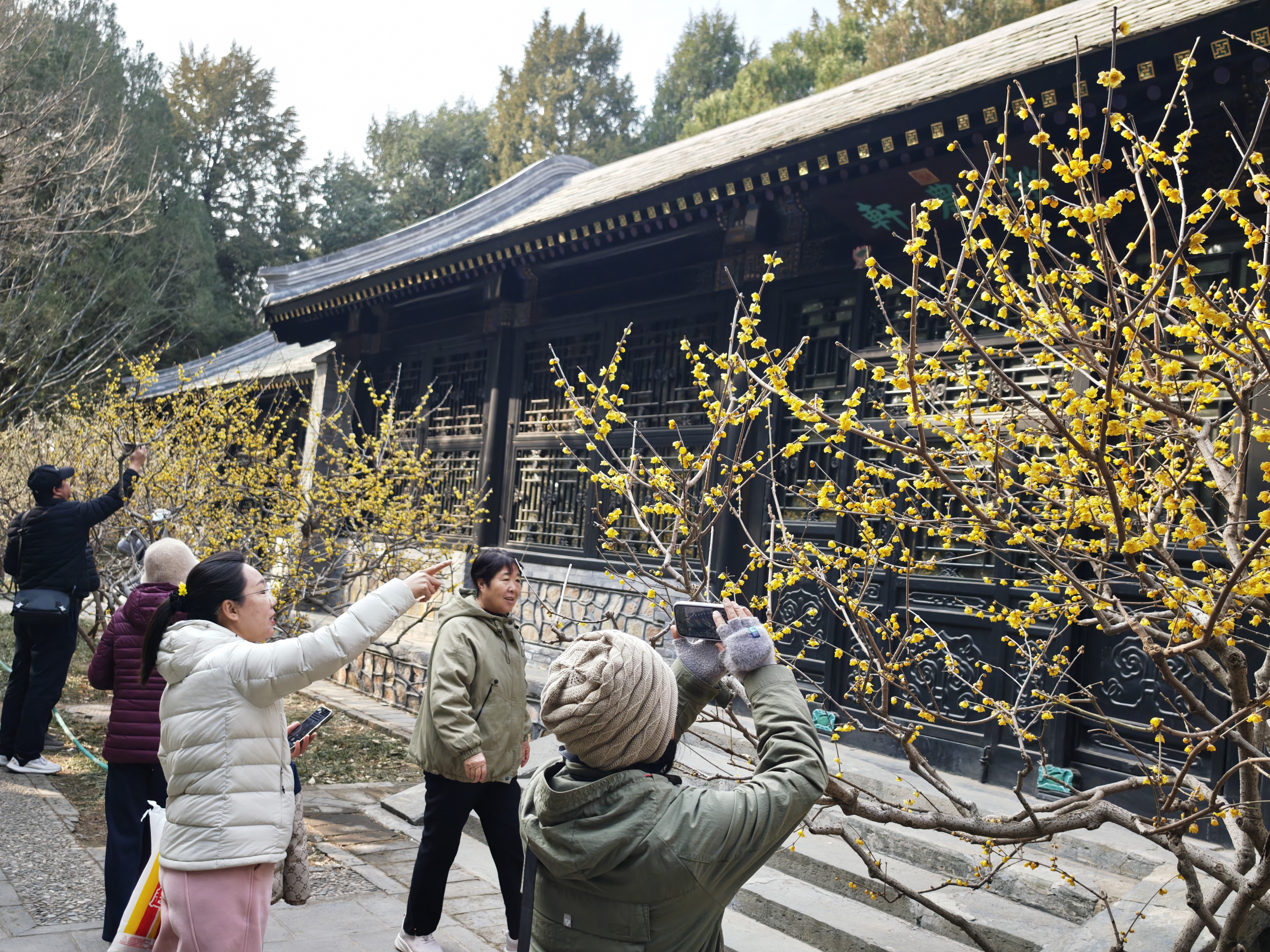 2月26日,游客在颐和园乐农轩观赏盛开的蜡梅。随着京城气温稳步回升,颐和园万寿山东麓的乐农轩区域内,十余株蜡梅已悄然绽放,进入最佳观赏期。