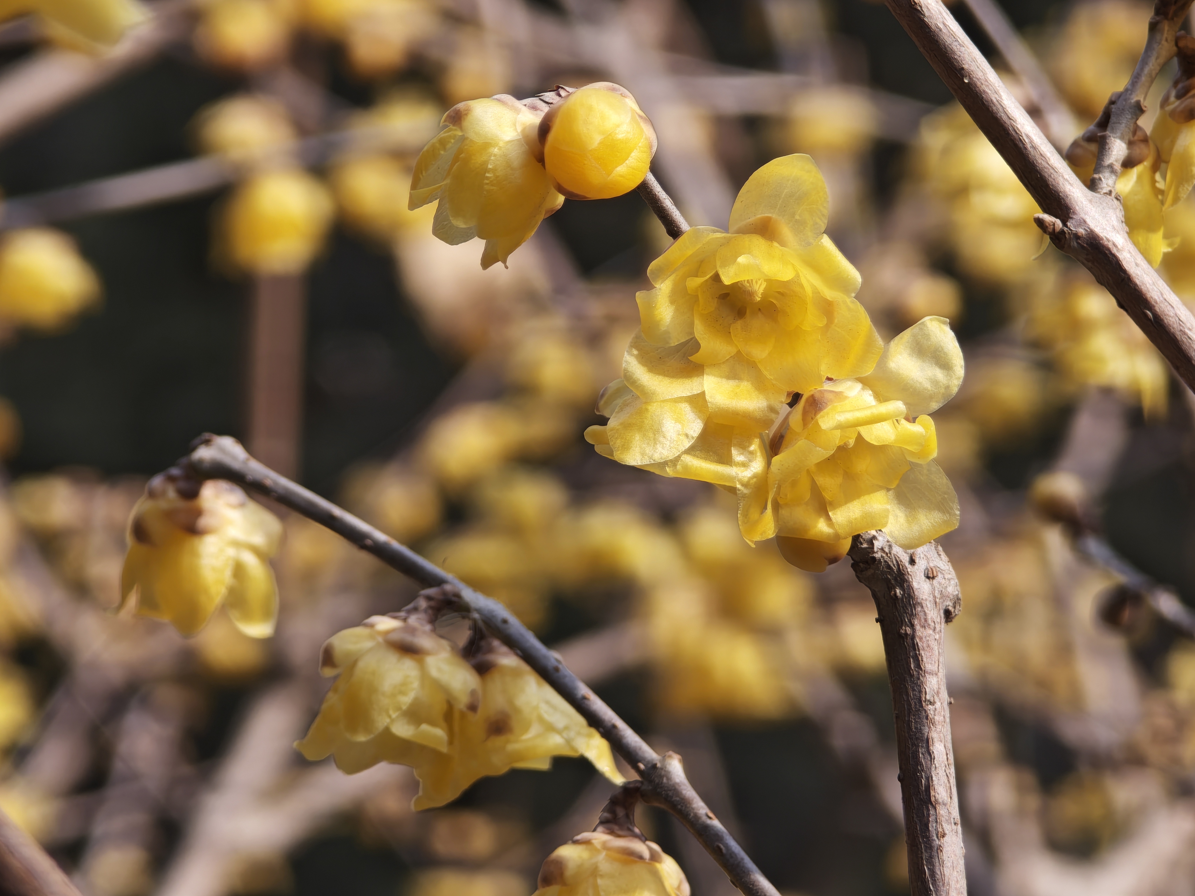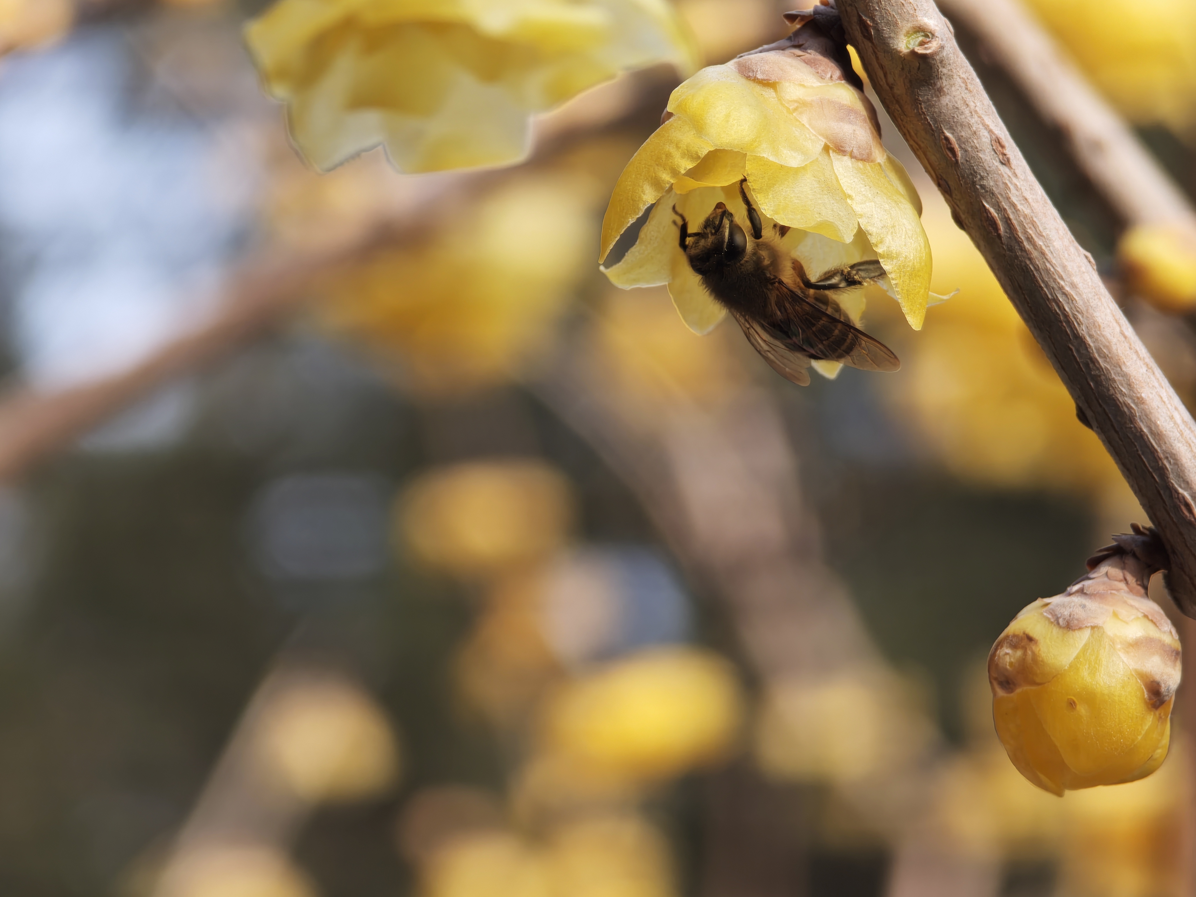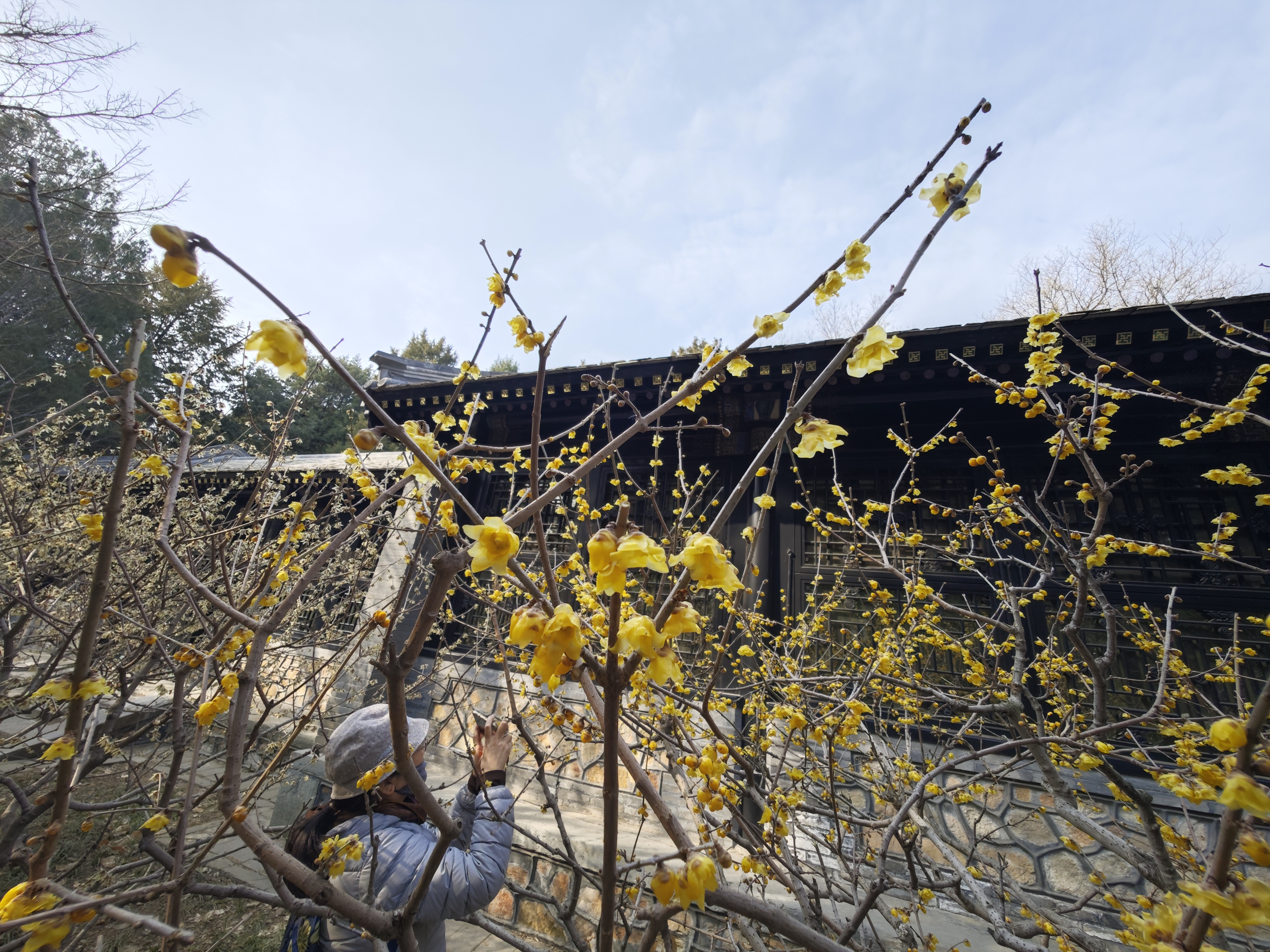 2月26日,游客在颐和园乐农轩观赏盛开的蜡梅。随着京城气温稳步回升,颐和园万寿山东麓的乐农轩区域内,十余株蜡梅已悄然绽放,进入最佳观赏期。