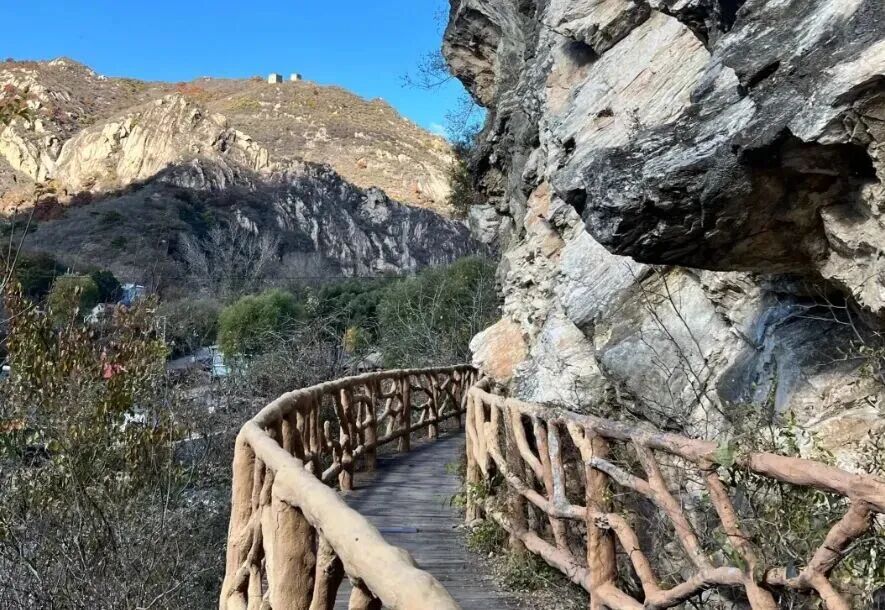 神堂峪栈道入选市级旅游休闲步道,经过提升工程后于2026年初正式重新开放。栈道起点位于雁栖镇不夜谷门区牌楼北侧,终点至神堂峪景区,全长7558米,沿途串联神堂峪、官地、上官地、石片四个村落,是北京沟谷内最长的山水滨水栈道。