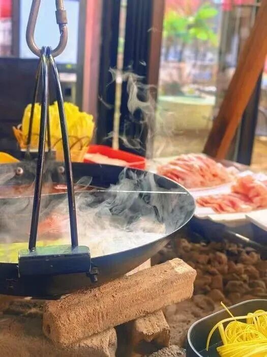 周周吊炉火锅餐厅融合乡村特色的建筑风格独具韵味,碎石花园蜿蜒小径、萌趣动物造型遍布其间,网红“上房揭瓦”造型更是打卡必选。中央悬挂的古朴吊炉下,蓝色火焰跳跃升腾,新鲜食材在锅中翻滚,原汁原味的鲜香在空气中弥漫,暖心又暖胃。