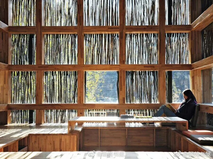 篱苑书屋,外墙铺满柴禾棍,阳光透过缝隙洒进室内,拍“坐在书屋里看书”的文艺照,静谧又出片。
