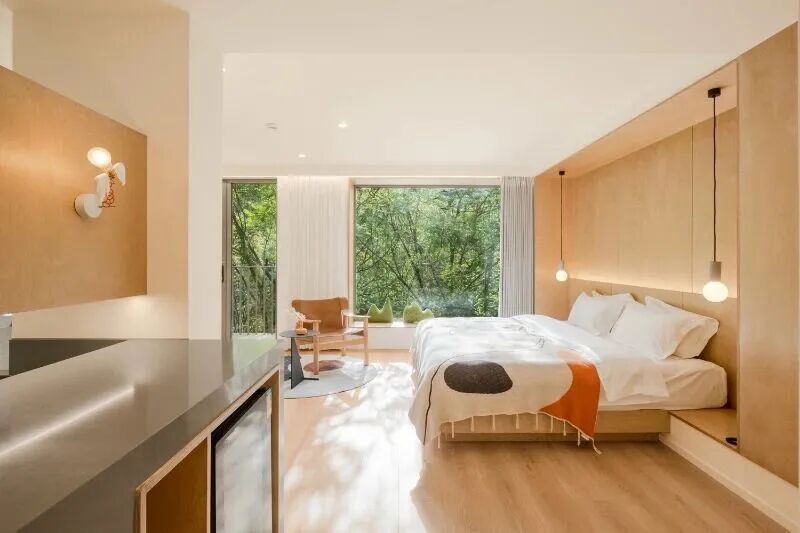 莲石山房以石头为缘起,寓意清雅幽静,19间不同房型的客房可接待45人左右,停车场、会议室、餐厅酒吧一应俱全。空间的开合转折、室内外的尺度呼应,让精神得以自由舒展,沉浸式感受归属感。