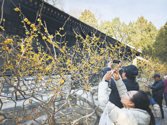 香山公园内两大赏梅区域——梅谷与碧云寺也呈现出各具特色的春日景致。附近的国家植物园卧佛寺素来是蜡梅的观赏胜地,共栽培了十余个变种、百余株蜡梅。其中,“素心”“磬口”“狗牙”“虎蹄”等晚花蜡梅品种处于盛花期,一簇簇金黄缀于枝丫,为早春的古寺增添了一抹灵动生机。