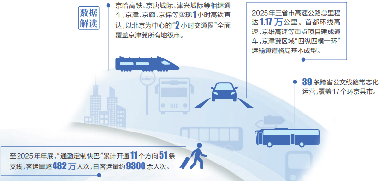 如今,从八大火车站出发,通过京广、京沪、京张、京哈等高铁及京津、京唐、京雄等城际铁路,京津冀主要城市间的“1至1.5小时交通圈”已基本形成,环京“1小时通勤圈”也初具规模。今年初,全国铁路实行新的列车运行图,京津冀首次开行环线高铁列车,为通勤旅客提供了更多车次选择,让跨城出行更具灵活性。