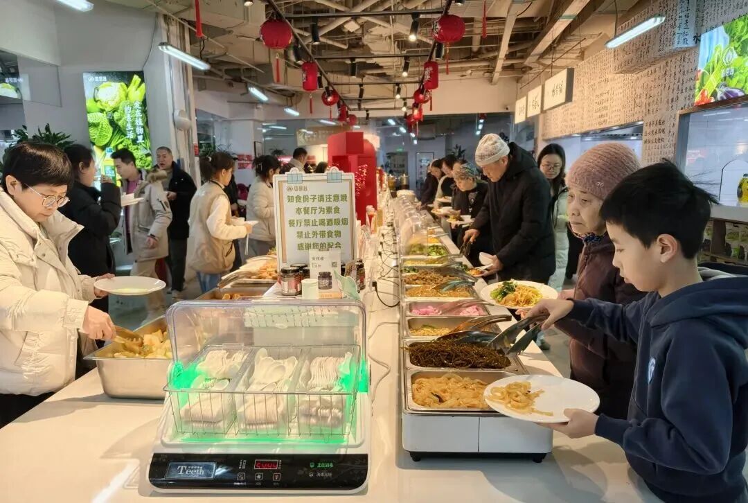 中午11点半,位于朝阳门地区银河SOHO下沉广场的“如是心 植物里的素生活”餐厅内已无空桌,有不少两鬓斑白的老人正围坐在餐桌前,一边唠家常,一边品尝着餐盘里的美食。在取餐区,50余种餐品琳琅满目,供顾客选用。这家餐厅自去年2月5日开业以来,凭借健康实惠、品类丰富的菜品,已成为周边老人每日必打卡的“幸福食堂”。