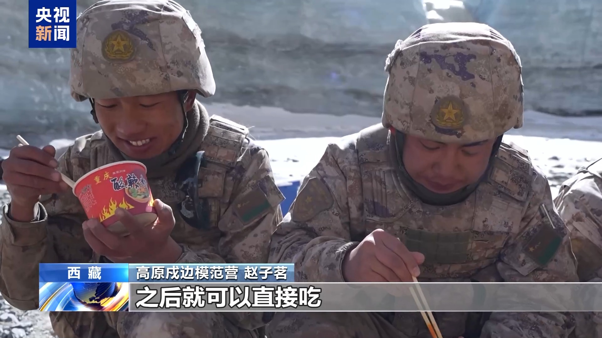 高原戍边模范营 赵子茗:根据每次巡逻的环境选择,像这次巡逻地点,有一面可以挡风的地方,我们可以用卡式炉,早上炊事班准备了一些肉、菜,提前都弄熟了,到这边就可以进行加热,之后就可以直接吃。要是在另外的巡逻地点,风比较大的地方,我们吃的就是自热干粮,也会提前卤一些牛肉、鸡腿,跟自热食品一起加热,加热之后也能够吃到热食。