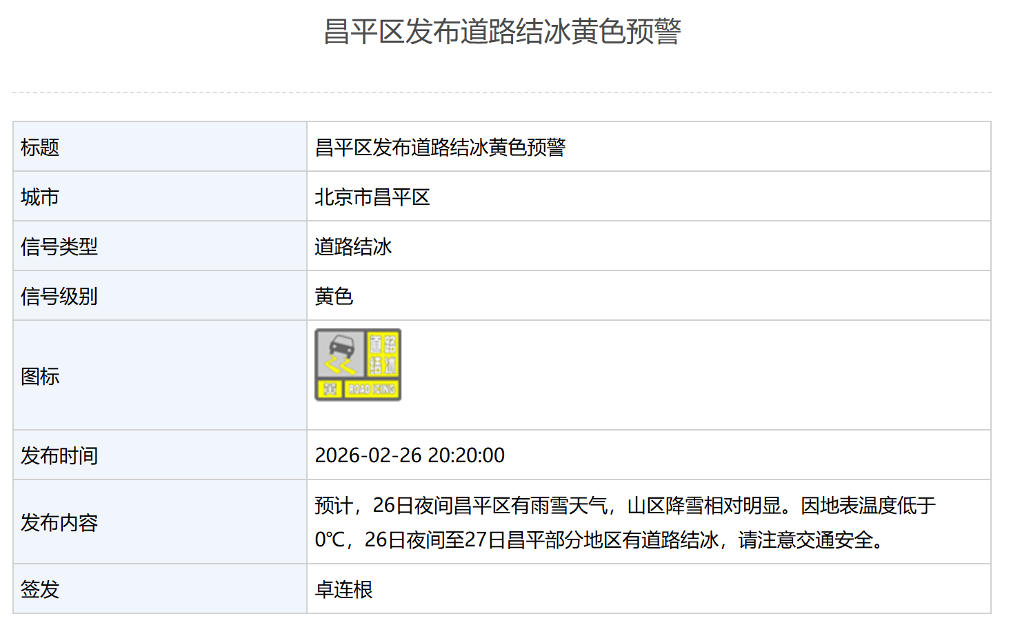 昌平区发布道路结冰黄色预警:预计,26日夜间昌平区有雨雪天气,山区降雪相对明显。因地表温度低于0℃,26日夜间至27日昌平部分地区有道路结冰,请注意交通安全。