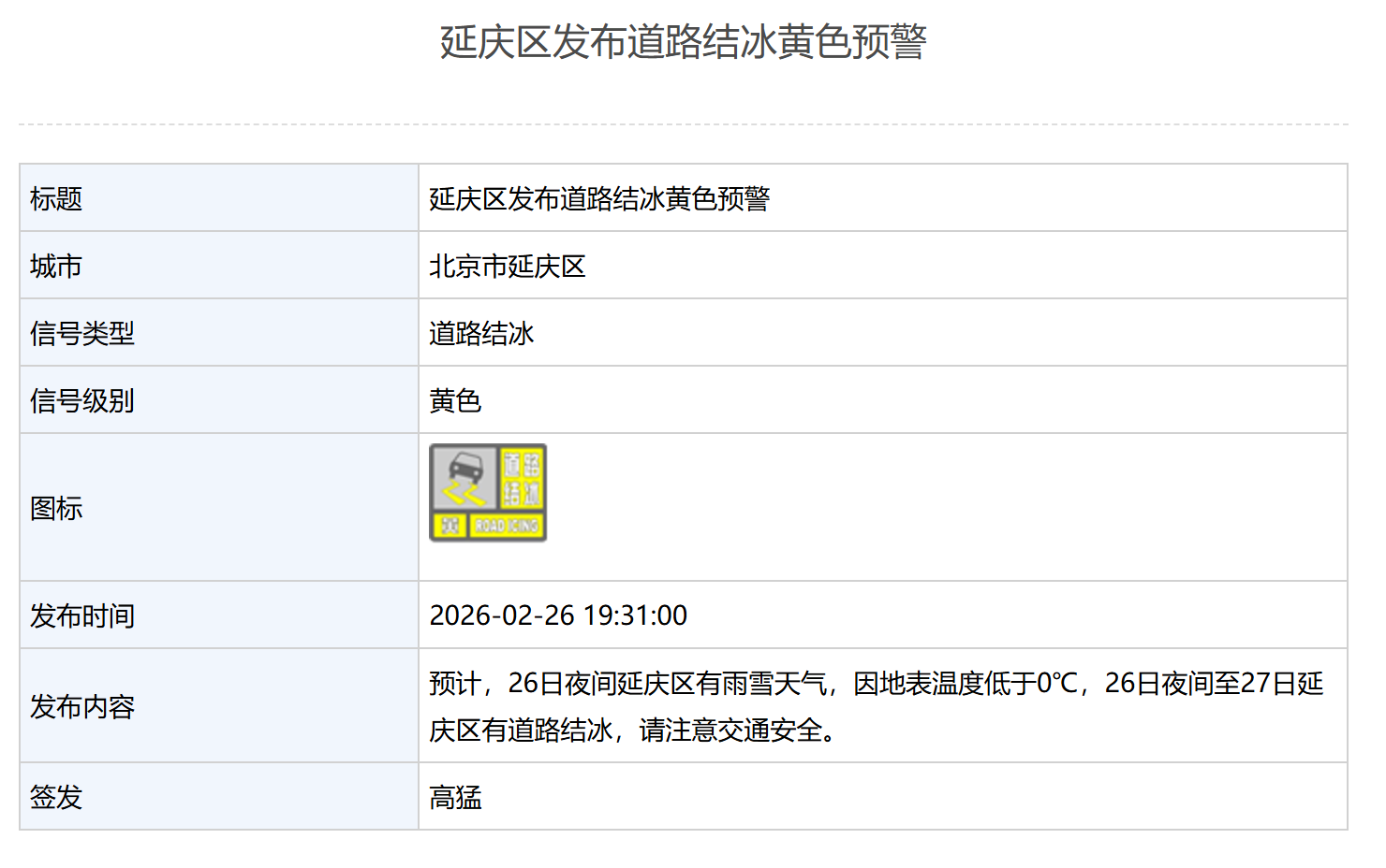 延庆区发布道路结冰黄色预警:预计,26日夜间延庆区有雨雪天气,因地表温度低于0℃,26日夜间至27日延庆区有道路结冰,请注意交通安全。