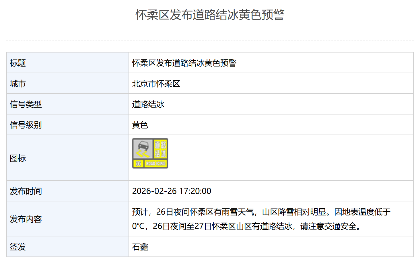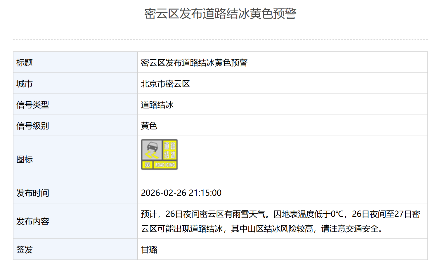 密云区发布道路结冰黄色预警:预计,26日夜间密云区有雨雪天气。因地表温度低于0℃,26日夜间至27日密云区可能出现道路结冰,其中山区结冰风险较高,请注意交通安全。