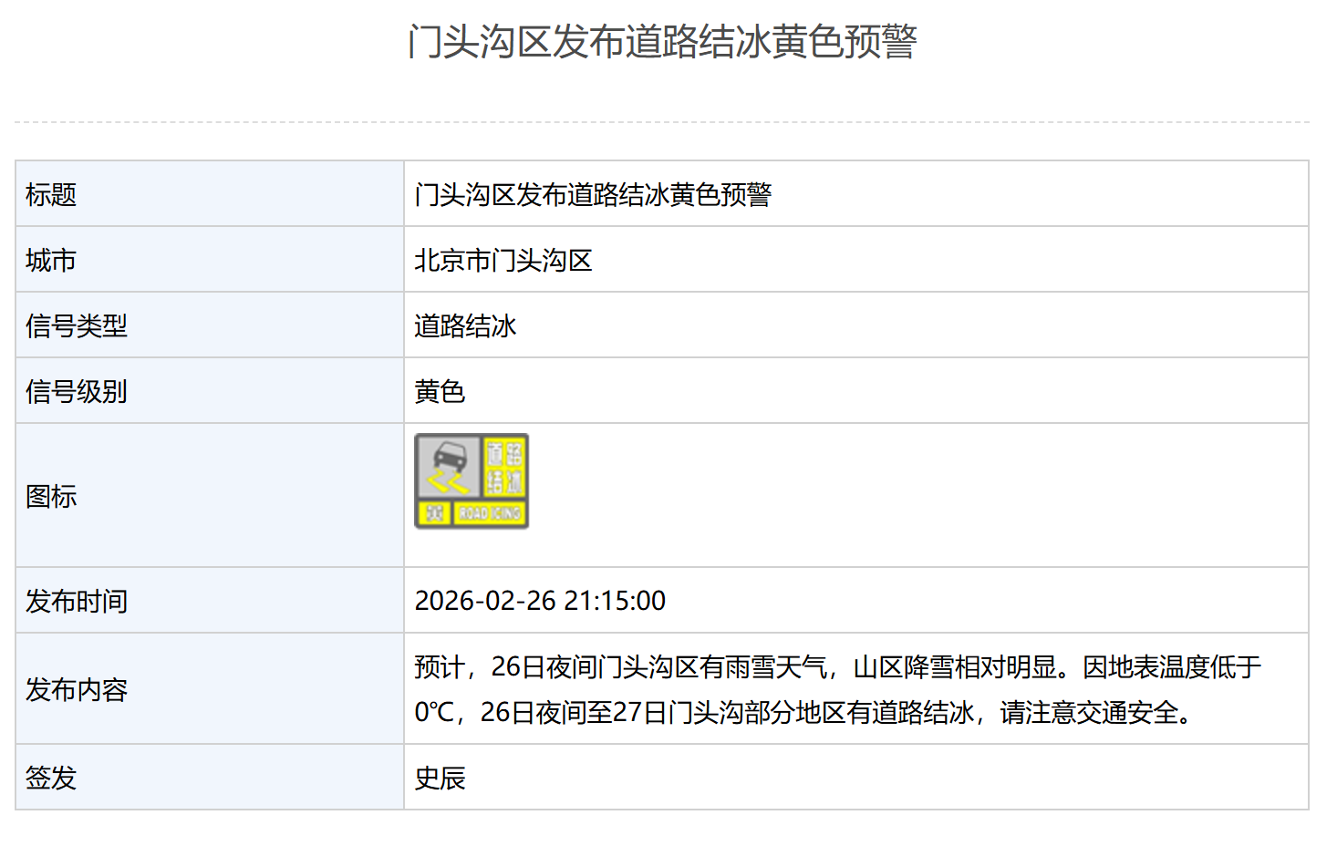 2月26日,北京已有7区发布道路结冰黄色预警。