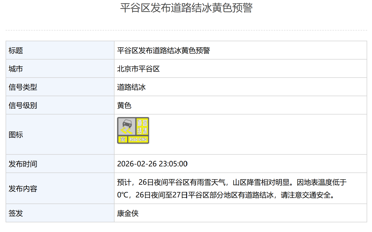 平谷区发布道路结冰黄色预警:预计,26日夜间平谷区有雨雪天气,山区降雪相对明显。因地表温度低于0℃,26日夜间至27日平谷区部分地区有道路结冰,请注意交通安全。