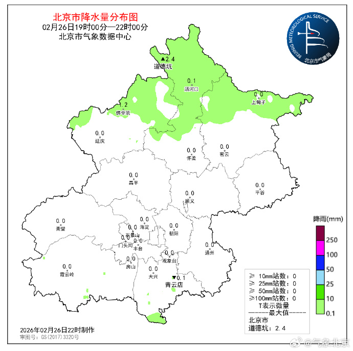 截至22时,我市大部地区已出现雨或雨夹雪,山区为雪。北部地区降水较明显,最大降水量出现在怀柔道德坑,2.4毫米,延庆佛爷顶新增积雪深度1厘米,密云上甸子0.3厘米;城区为微量降水,无积雪。