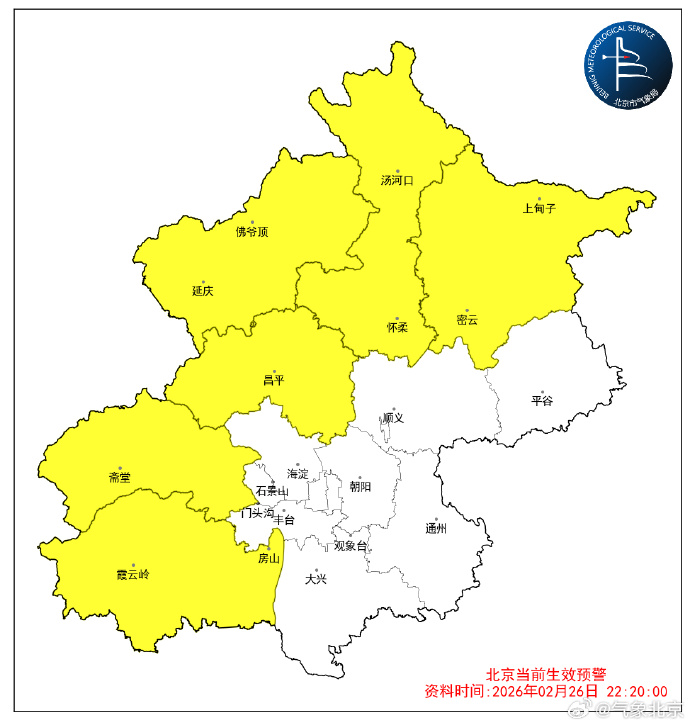 目前,延庆、怀柔、密云、昌平、房山、门头沟已发布道路结冰黄色预警信号,请注意交通安全。